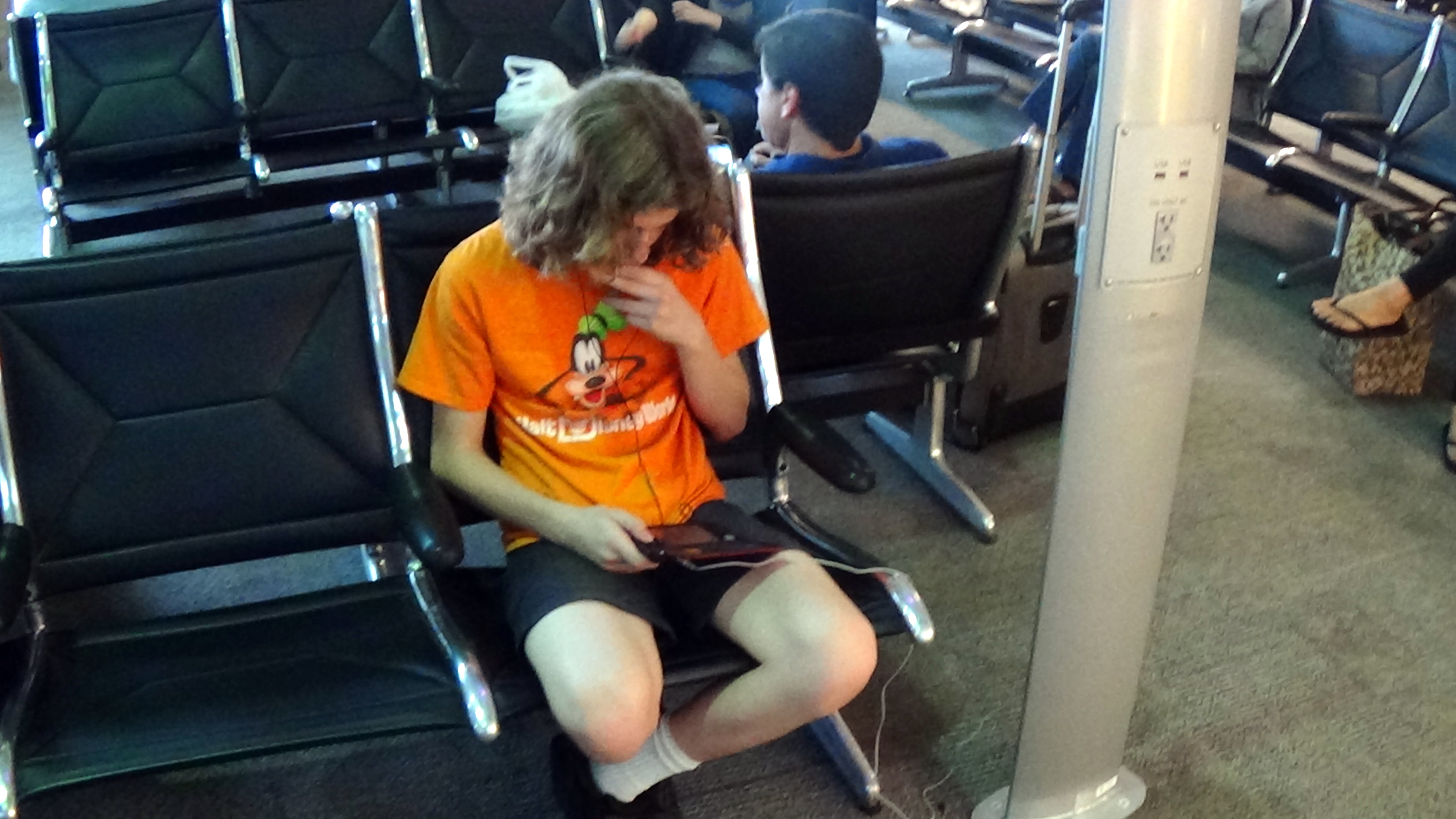 11 a.m. — Sitting in the airport having just passed through security. Luggage all checked, waiting for our plane to depart at 12:26 for Atlanta. Nathan is trying out his new 3DS game he was allowed to play with once we are underway — Pokemon Mystery Dungeon Gates to Infinity. Betsy and Carly are working on puzzle books. I think I will be taking a few pictures and then do a bit of Nook reading.