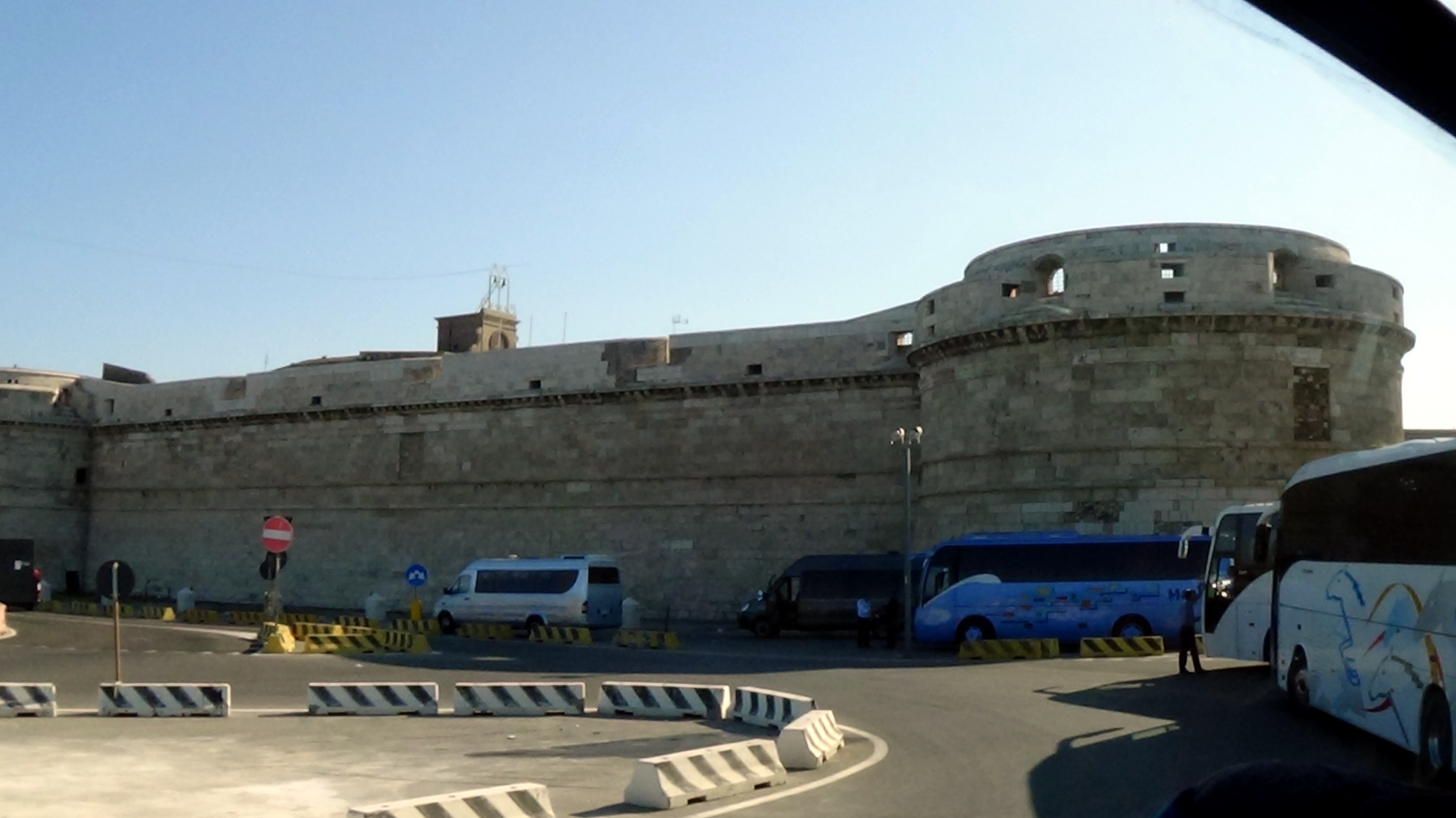 We got up with dual alarms — the wake up call on the cabin phone, and the alarm on my world clock alarm clock. Four showers and off to the Raffle Court terrace for breakfast, then off the ship in the first wave of people through the card readers. I think we even beat a lot of the people with excursions. The ship provided a free shuttle bus to get us from the ship to the entrance to the terminus — which is the guarded by an impressive stone fort.