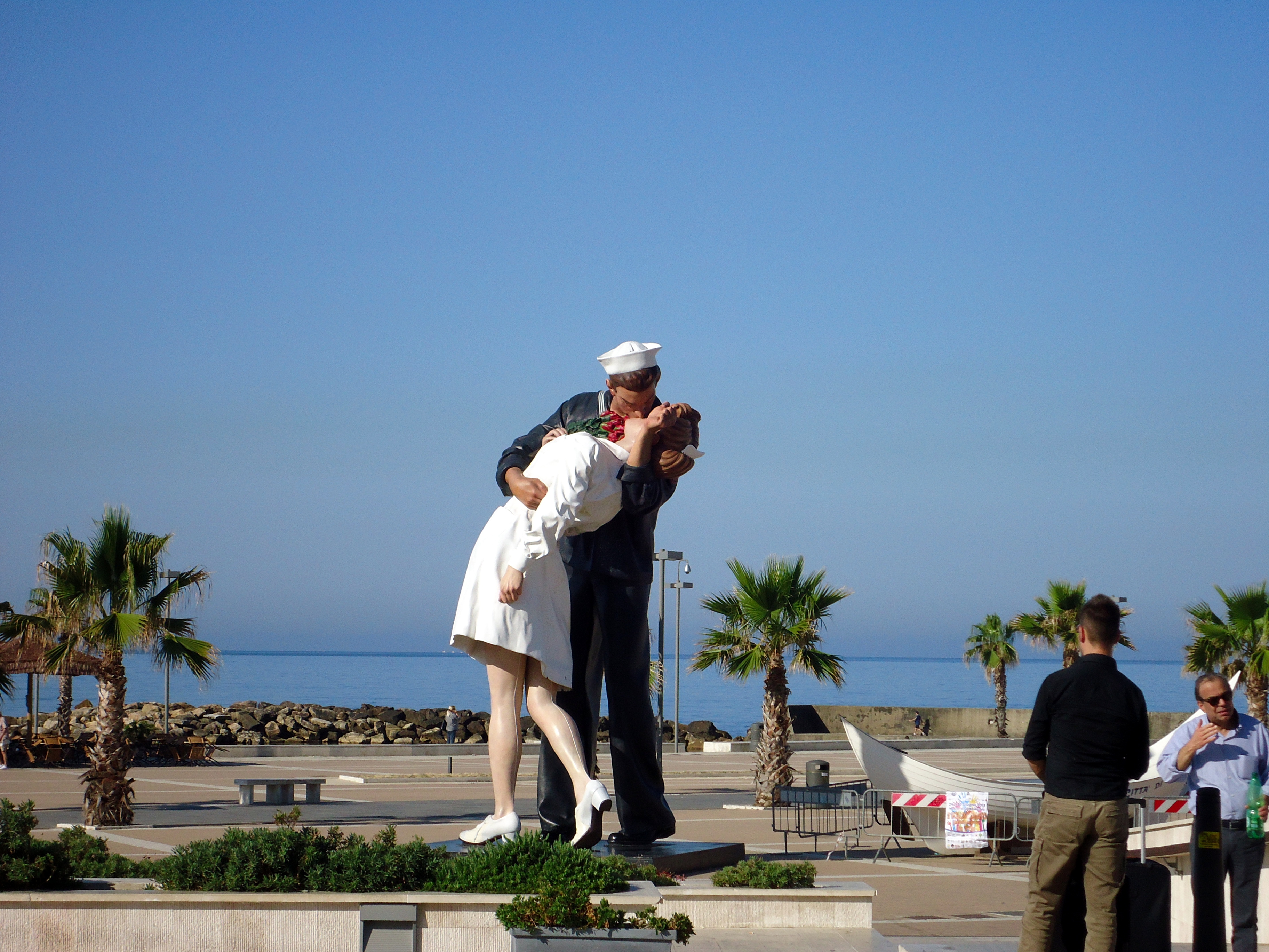 Once we walked out of the port terminal, we walked along a coastal street to the train station. In the seaside park beside the street was an unusual and unexpected statue of a sailor kissing a nurse. I am not sure why it is there.