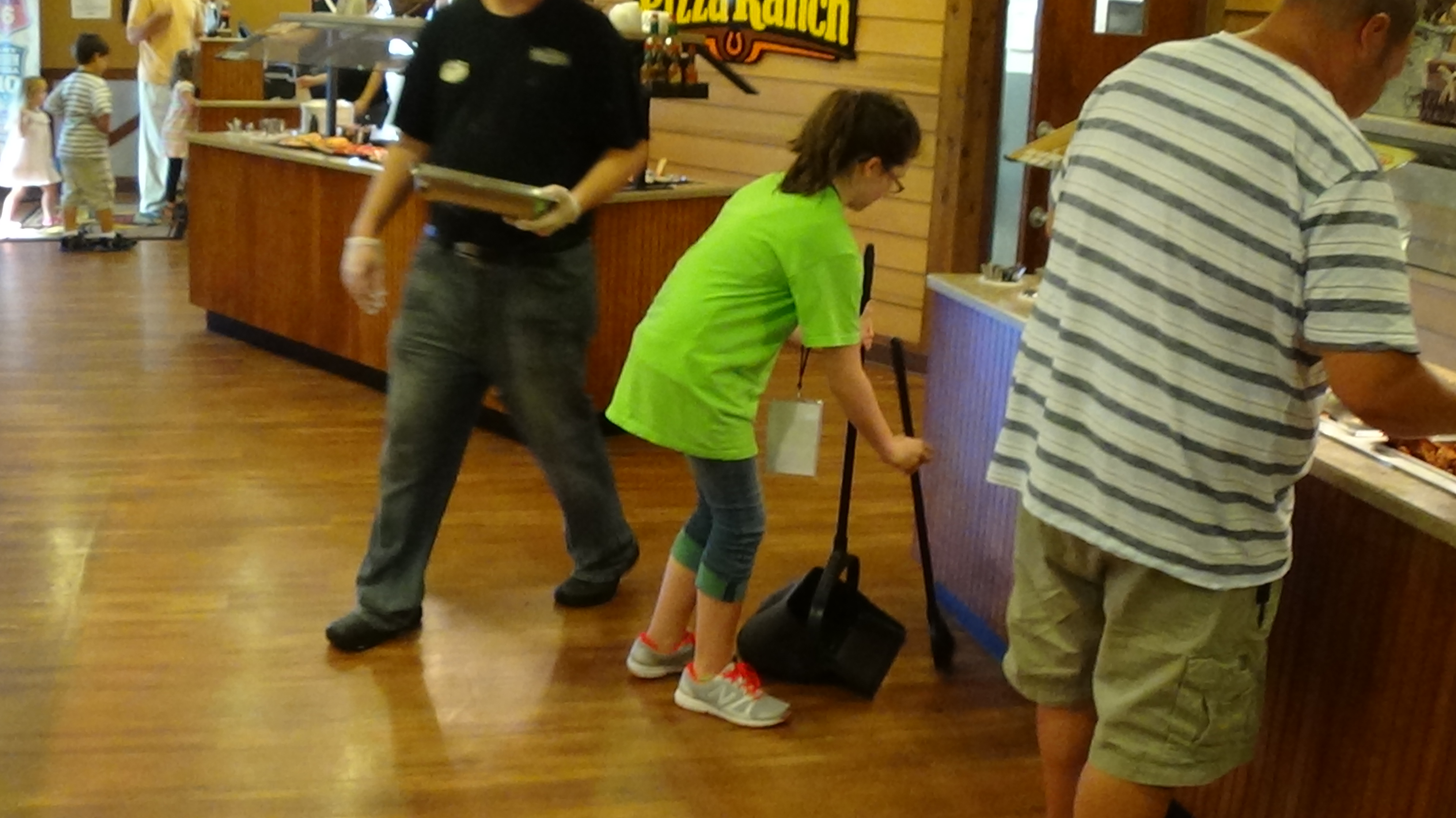 The evening for the youth began at 4:30 with an orientation by the Pizza Ranch staff, followed by heading out to bussing tables, sweeping floors, etc.