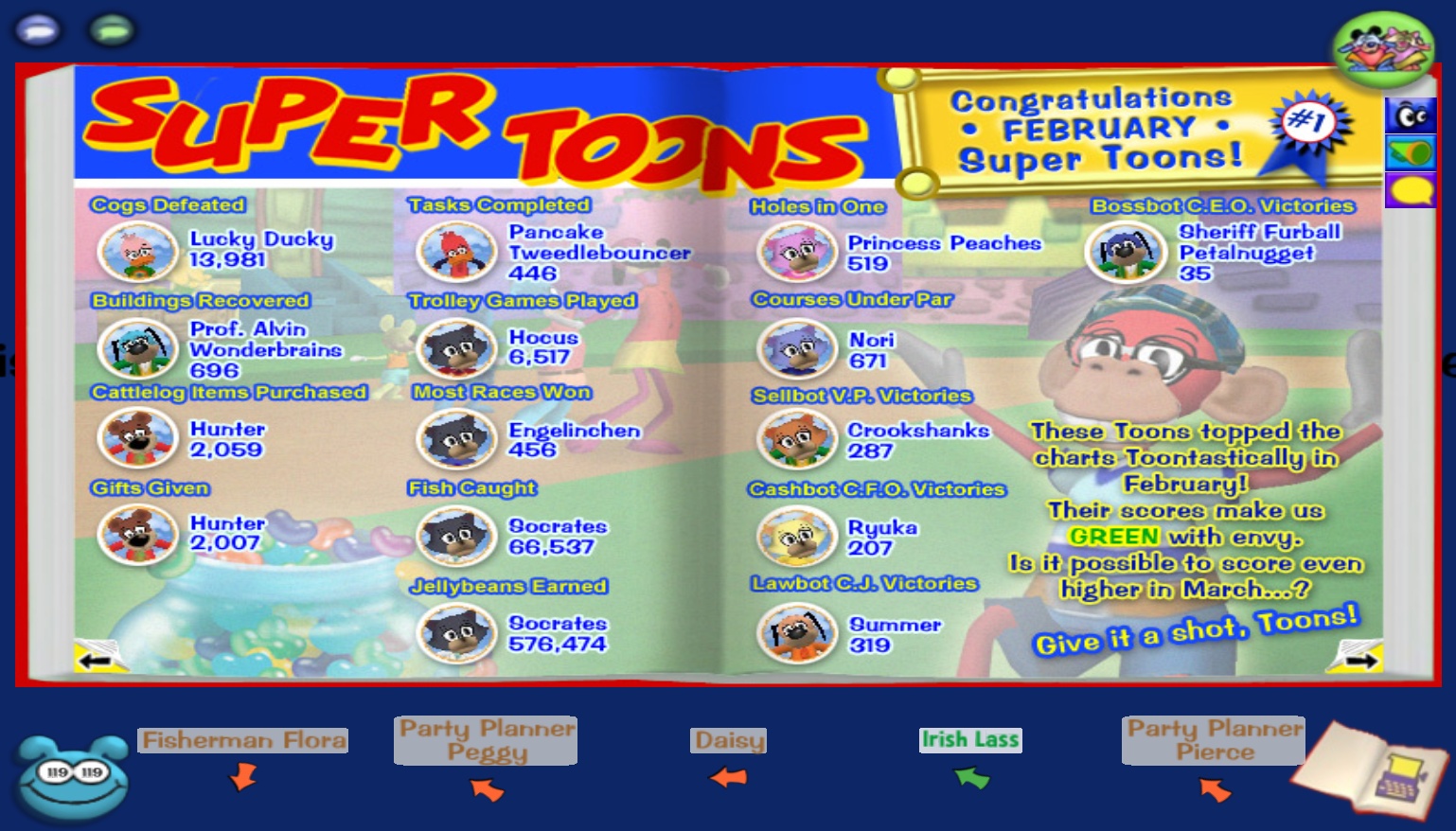 More recently, in the past couple of years, I started doing cog buildings as my main way of earning points for top cog promotions, earning stars as part of the “Toon Platoon” and found I’d accidentally one month became the top toon for taking over cog buildings that month. Wonderbrains managed that feet 5 or 6 times in the ensuing months.