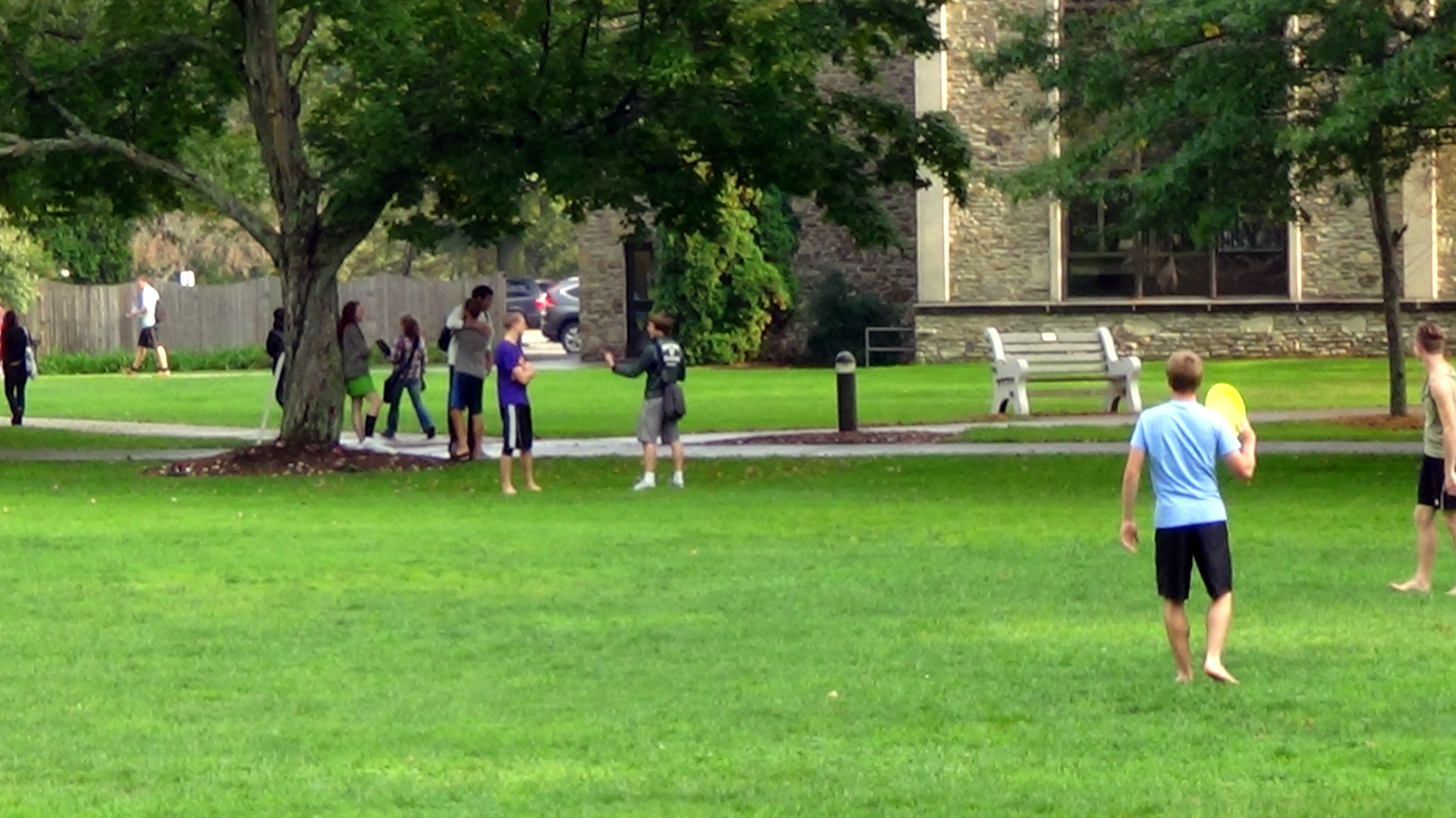 While they were playing on the chapel steps, a pickup game of frisbee football (or frisbee something), was going on on the quad. We watched the students playing there as we we listened to the music, until both broke up.