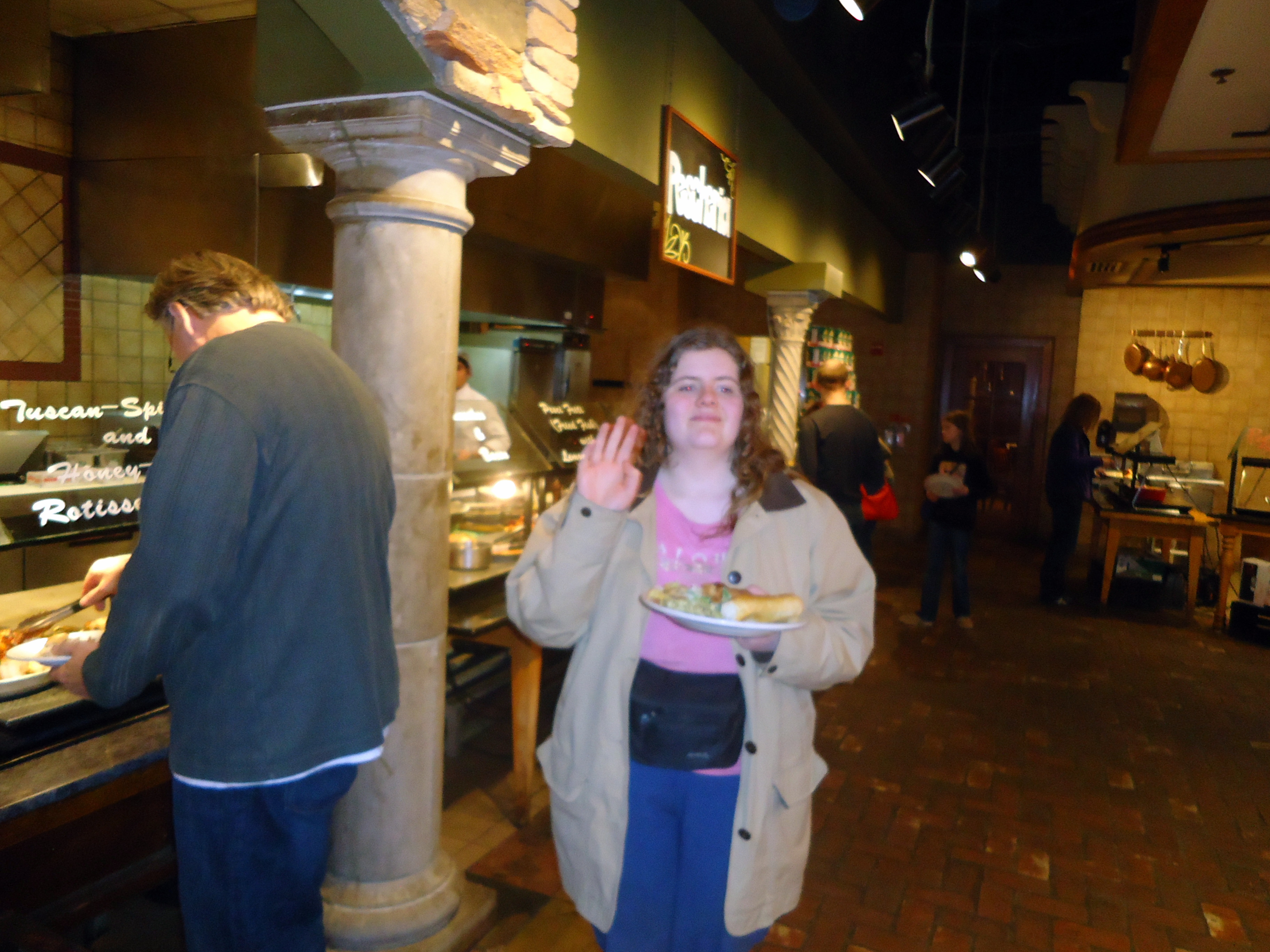 Carly was quite adventurous. She started with a breadstick and Caesar salad (Caesar is her favorite salad), found the fettuccine Alfredo on the pasta bar, and tried several of the different types of chicken offered.