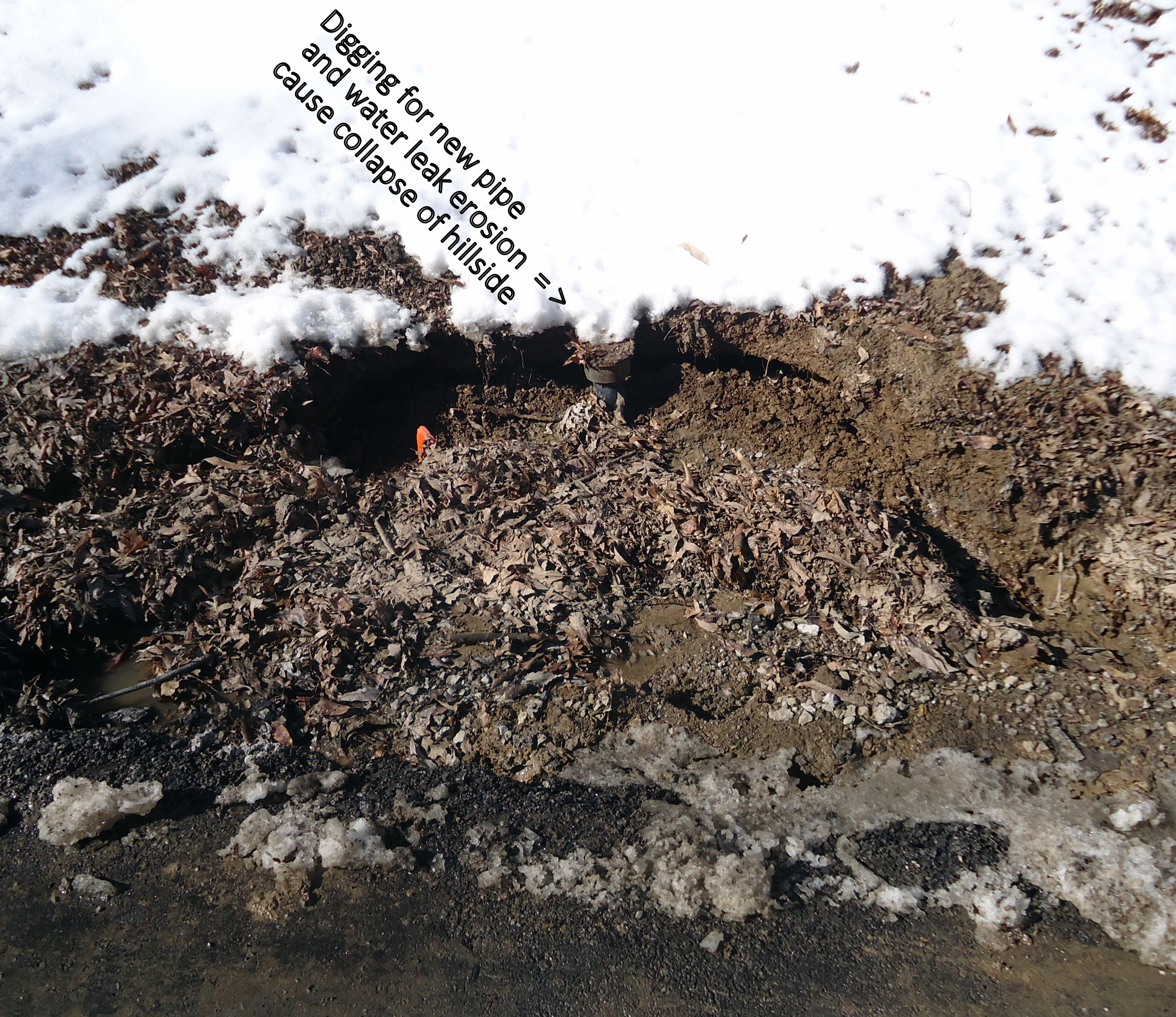 Part of the reason we had so much muck going through our pipe to plug our culvert, is the digging they did right in front of our house to install some new connection pipe. In the picture above you can see a pipe sticking out of the hillside — or what is left of the hillside. The digging and subsequent erosion from the water main torrent collapsed a significant portion of the hillside and sent it downhill to plug our culvert.DSC04216