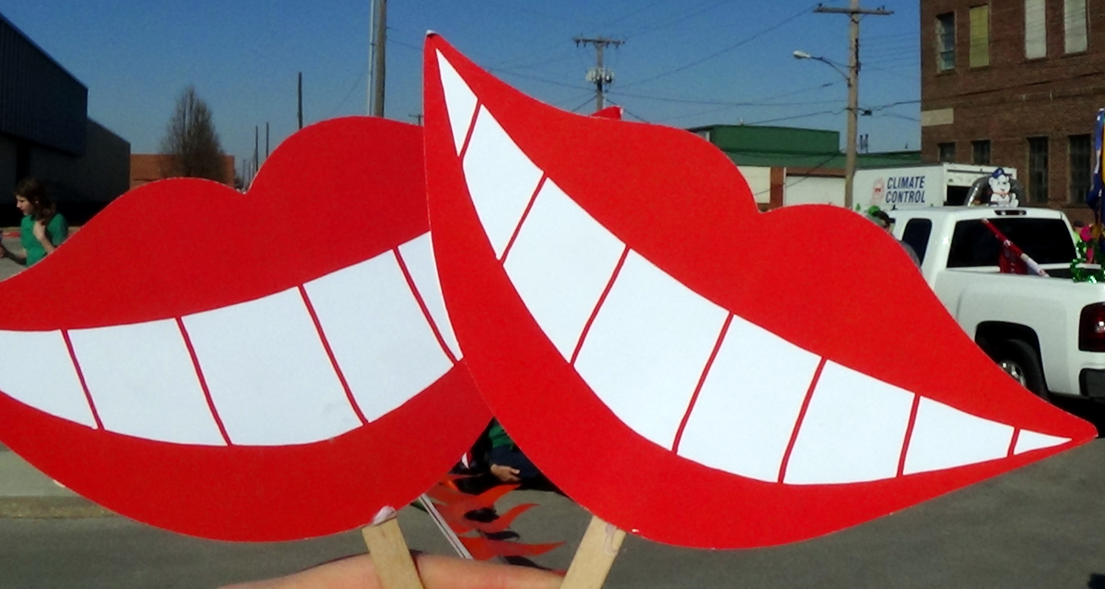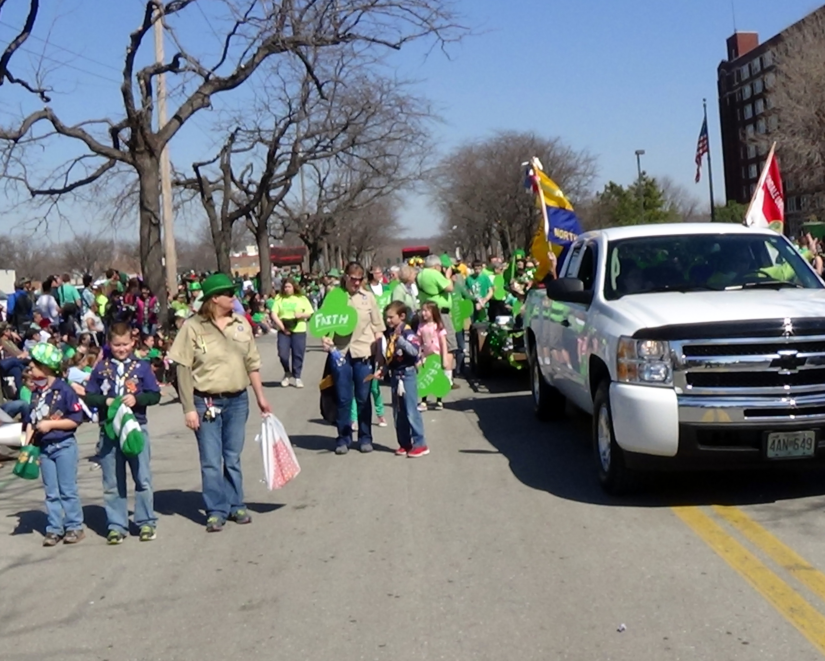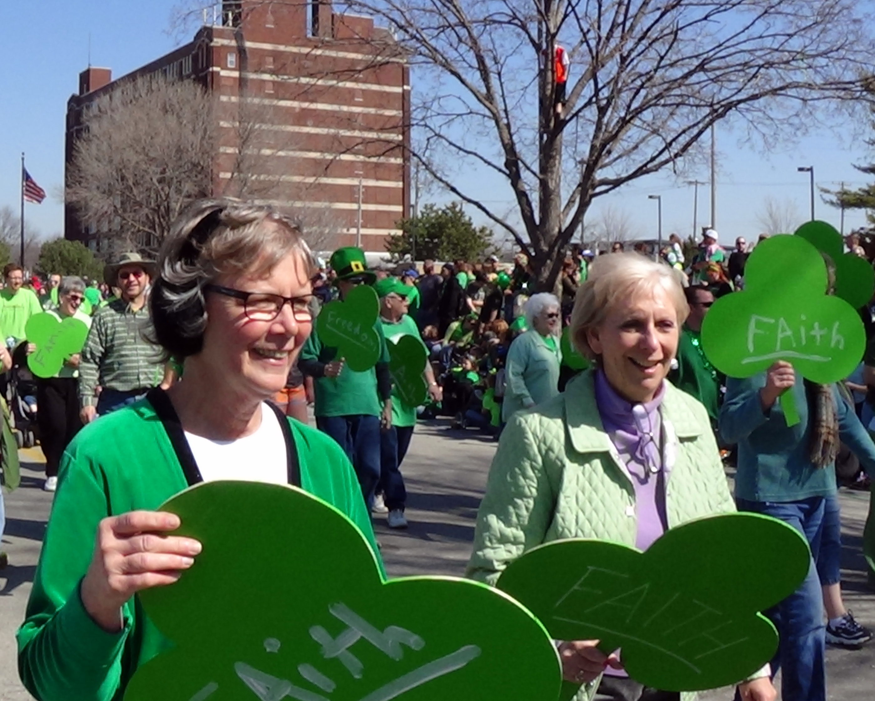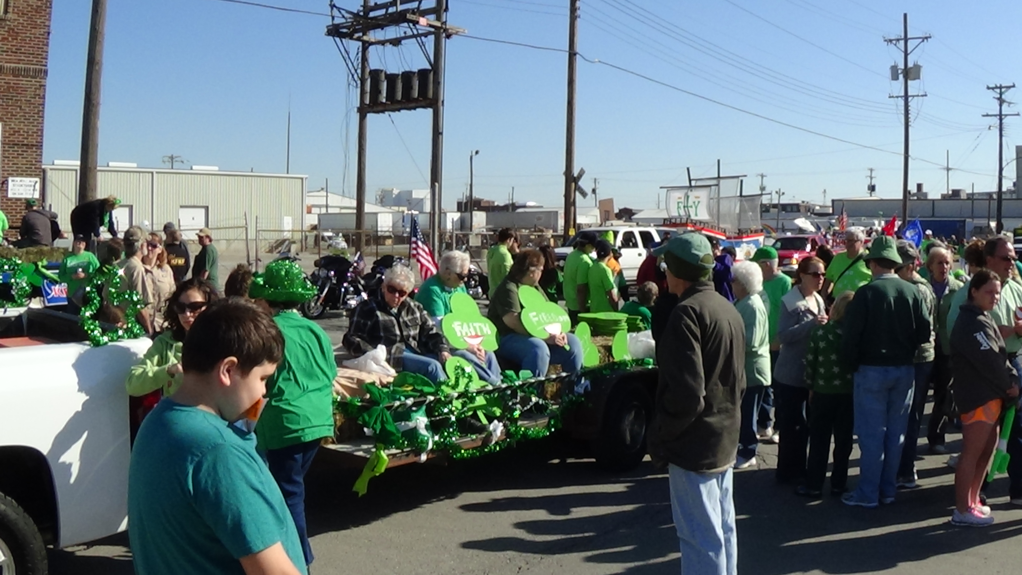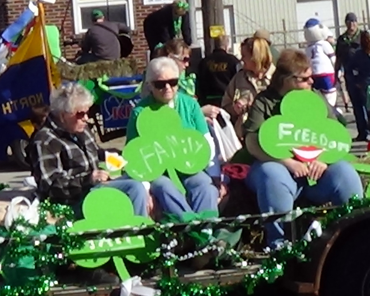 Everyone gathered on 14th Ave., between Iron and Erie, where we were float 14 in Section 3, to wait the 11 a.m. start of the parade. Everyone was handed a stick with a smile on it, and their were shamrocks with Faith, Family, or Freedom written on them.
