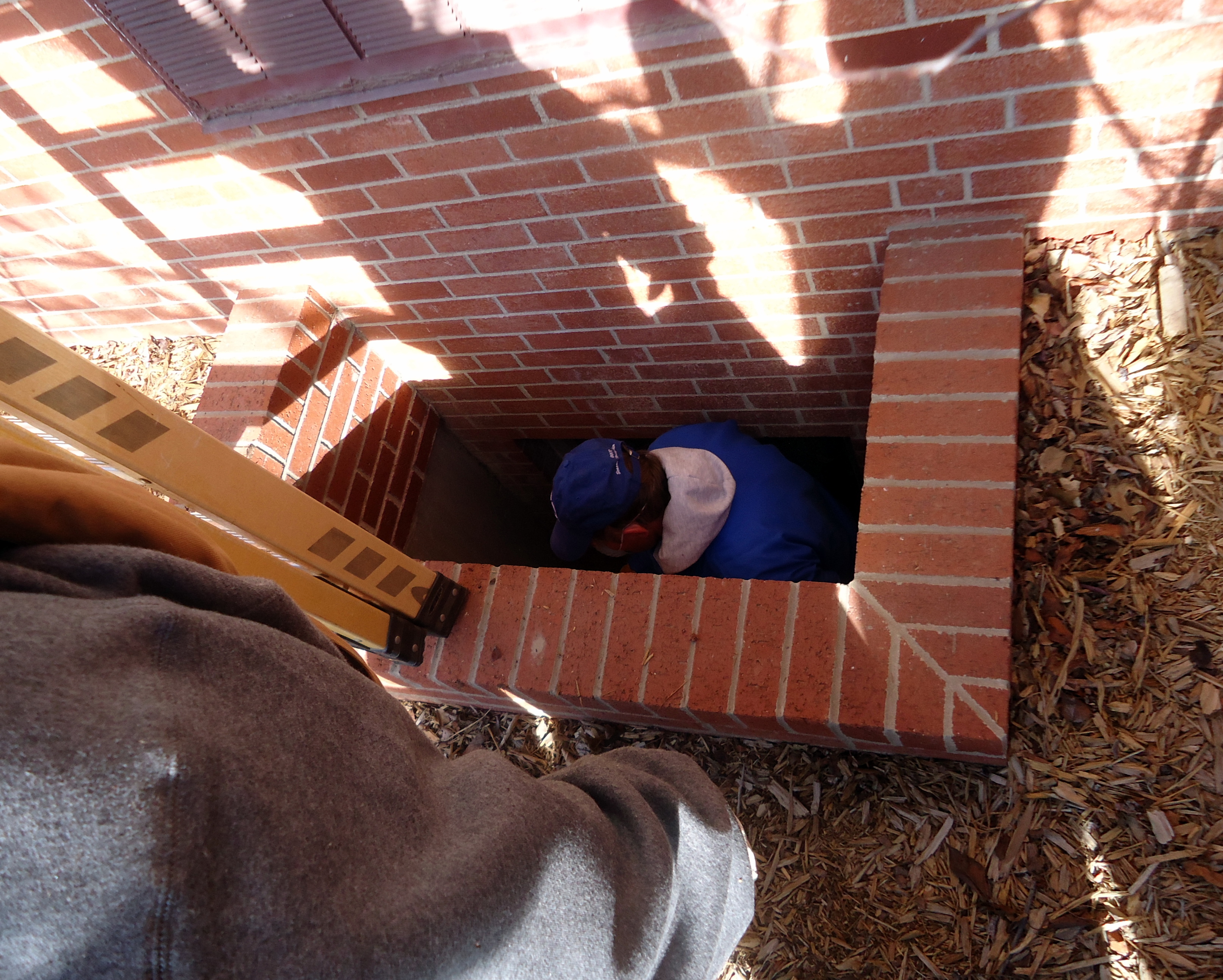 The church has a lot of window wells, some of them quite deep. David Garrett, one of the tallest among us, was the one to use a ladder to climb down into them, bag up the leaves, and then come back out.