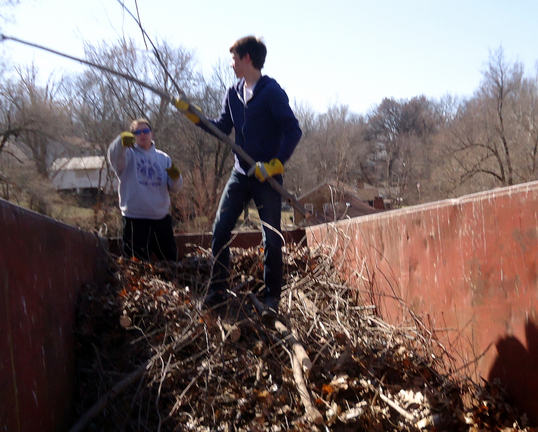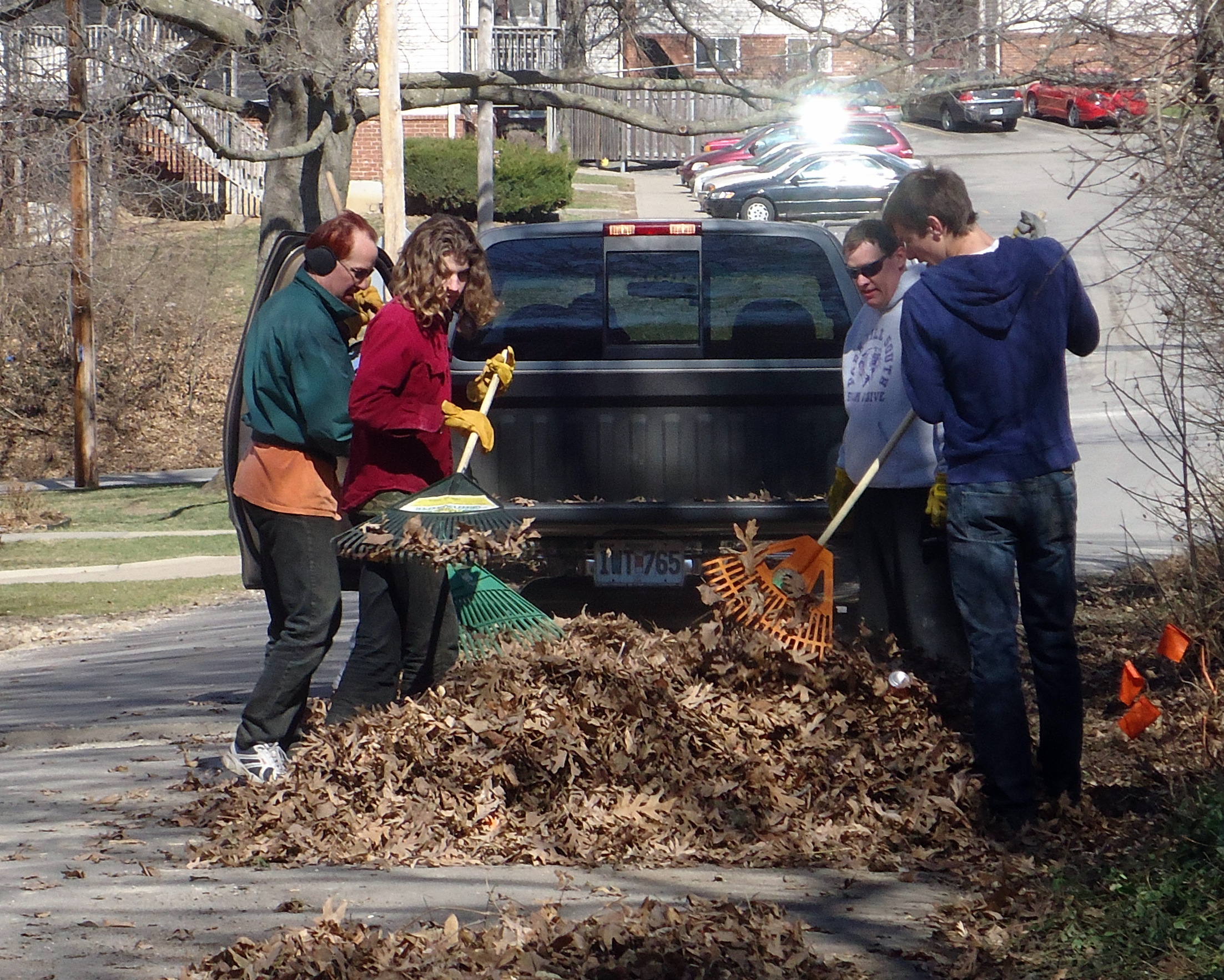 One of the big annual projects is raking up the leaves on the Bellefontaine Ave. slope of the church. I don’t know which group of people raked them all up into piles, but Luke and Scott were the first to start picking the leaves up, raking them onto a tarp and then carrying them up to the dumpster. Nathan and I saw them doing this on one of our trips to the dumpster and decided to join in and help. So on the next trip the 4 of us hauled the tarp up to the dumpster, which I believe was a lot easier.