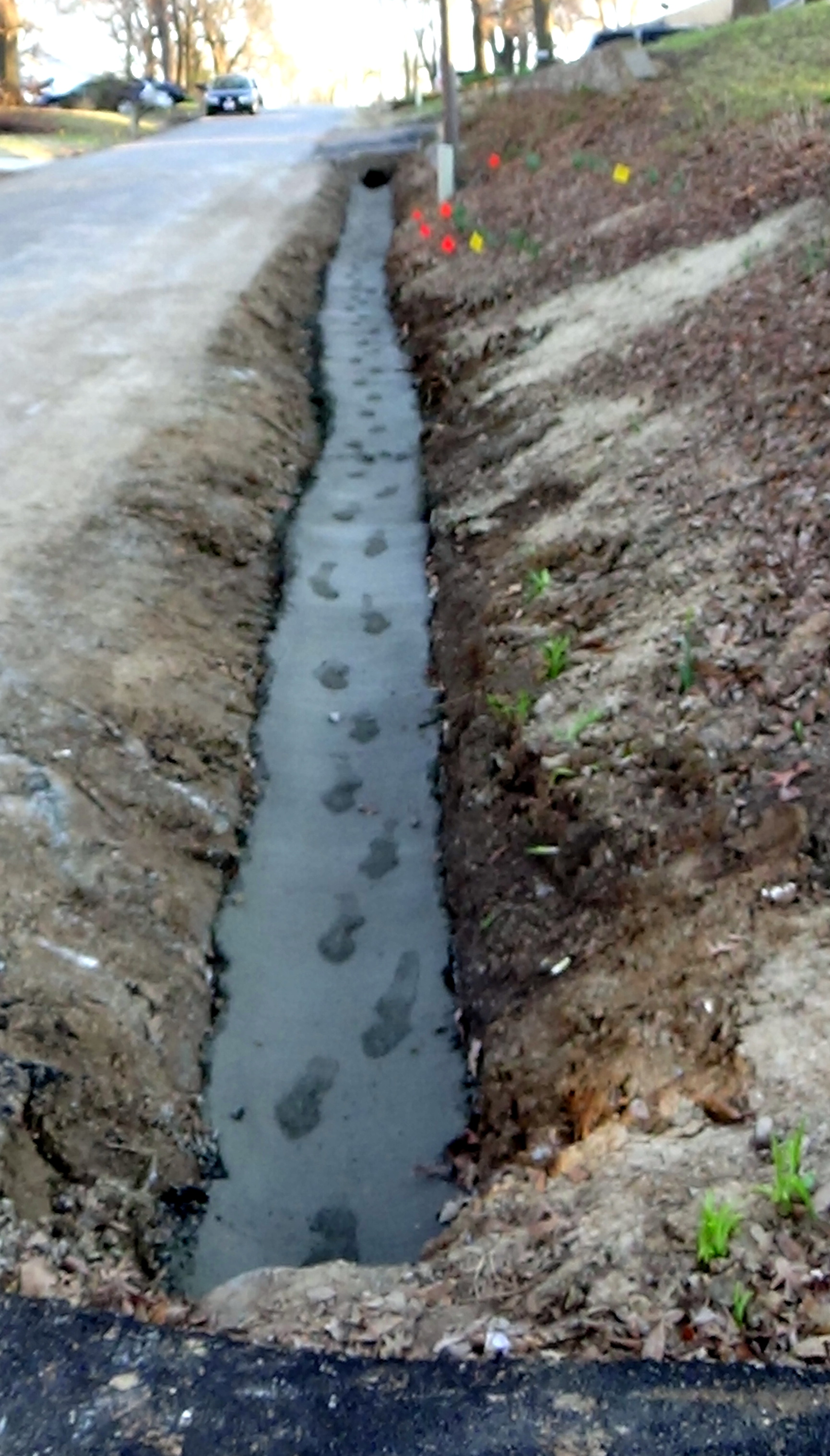 The concrete itself looks fine, but if you look at the depth on the photos, you will notice that the ground level is below the concrete on both sides for long stretches. The water isn’t going to run down the concrete, but beside it. They also didn’t clean the dirt out of the culvert pipe itself. I’ll have to take a shovel and do that once I know they are clear and the concrete is set enough.
