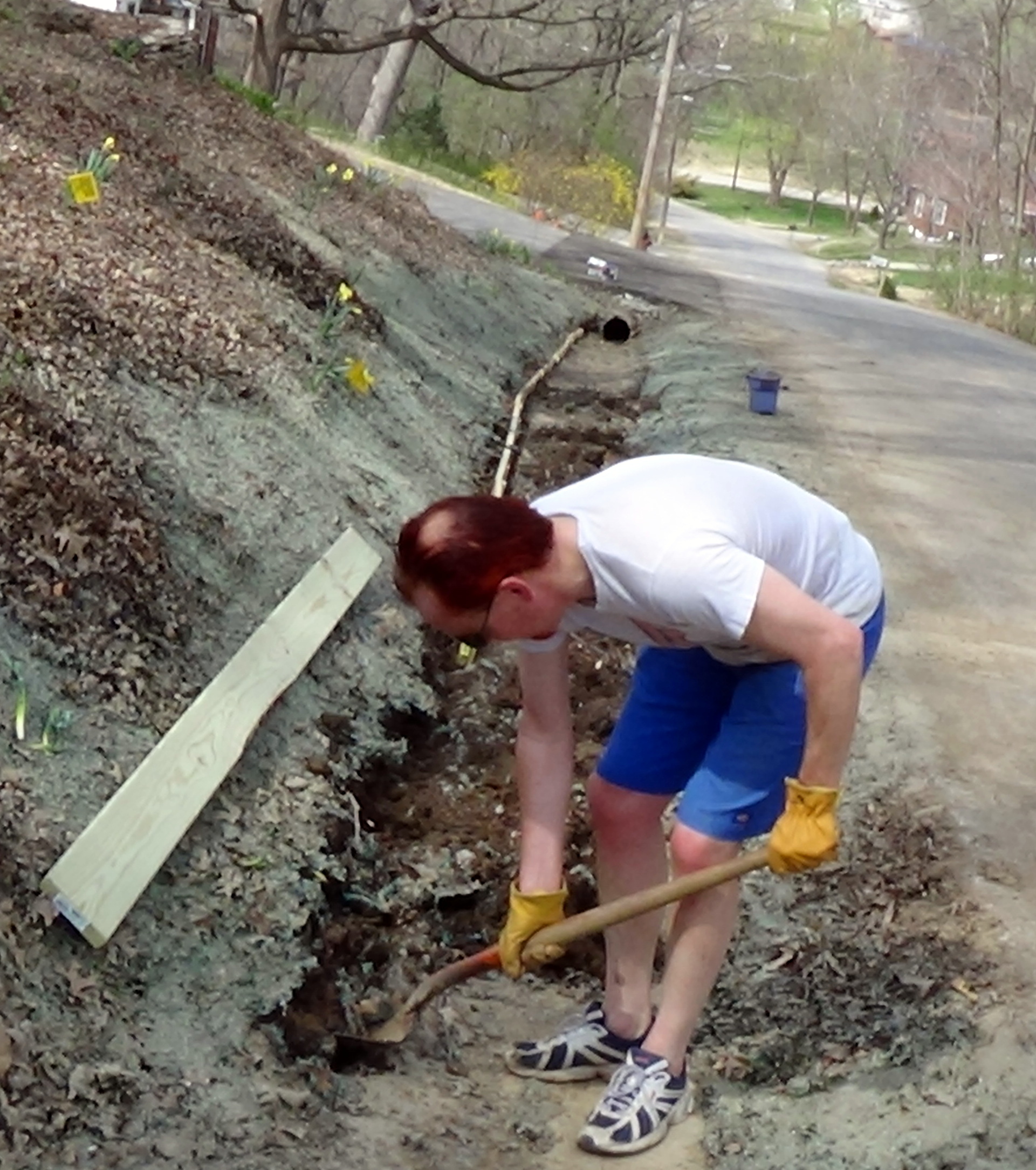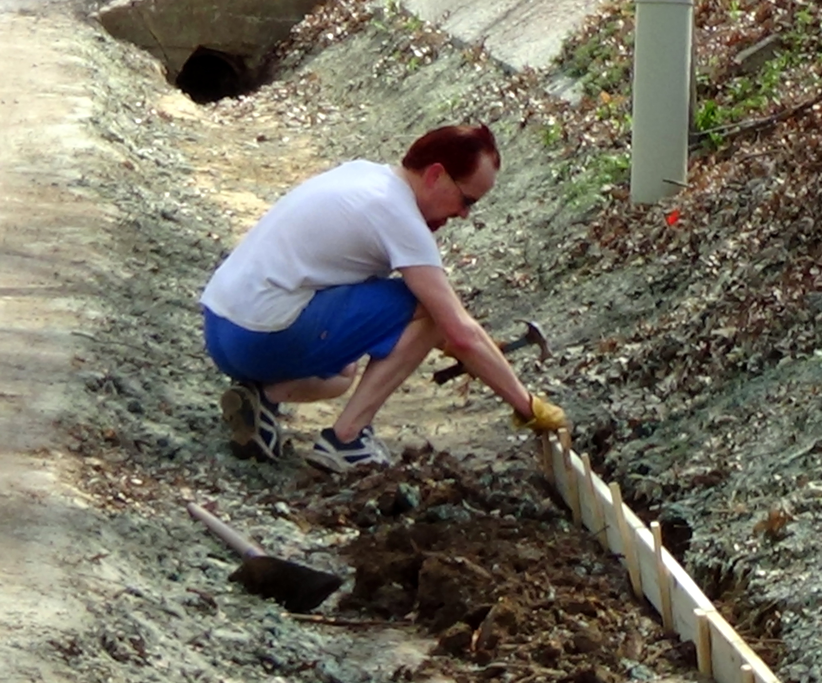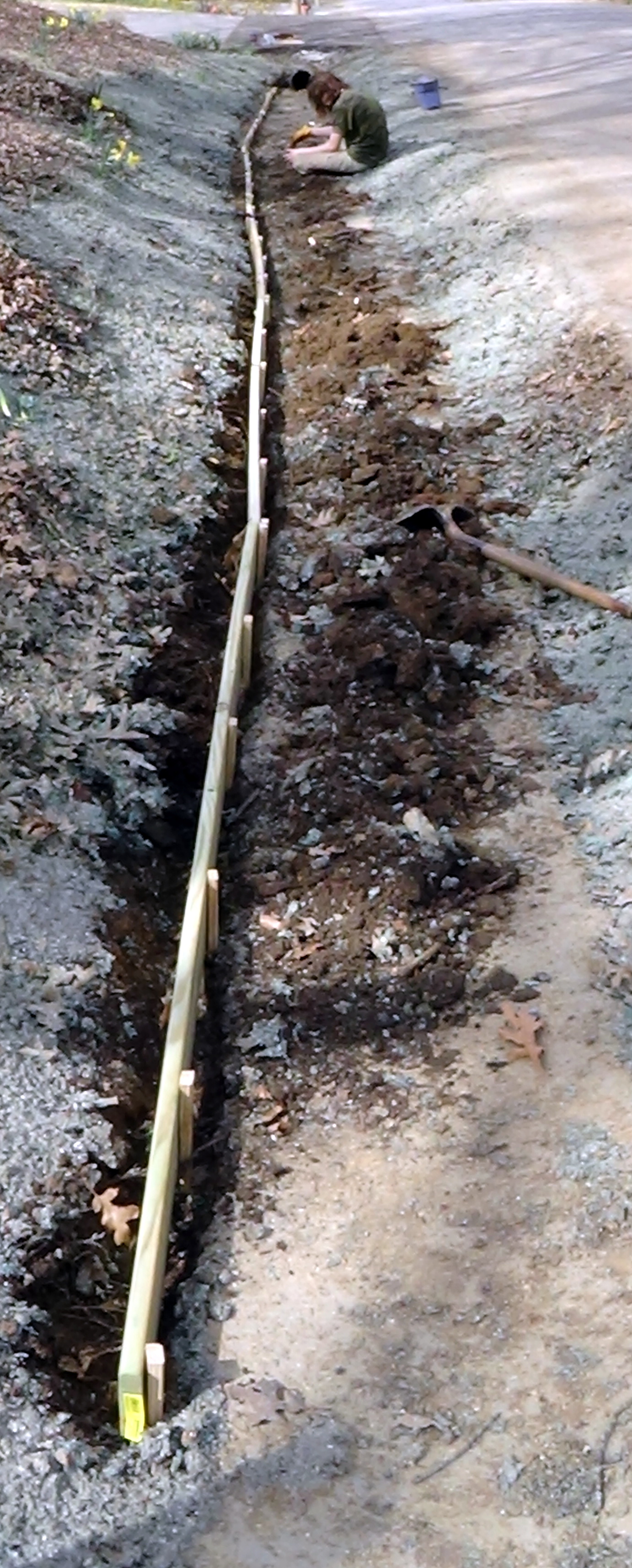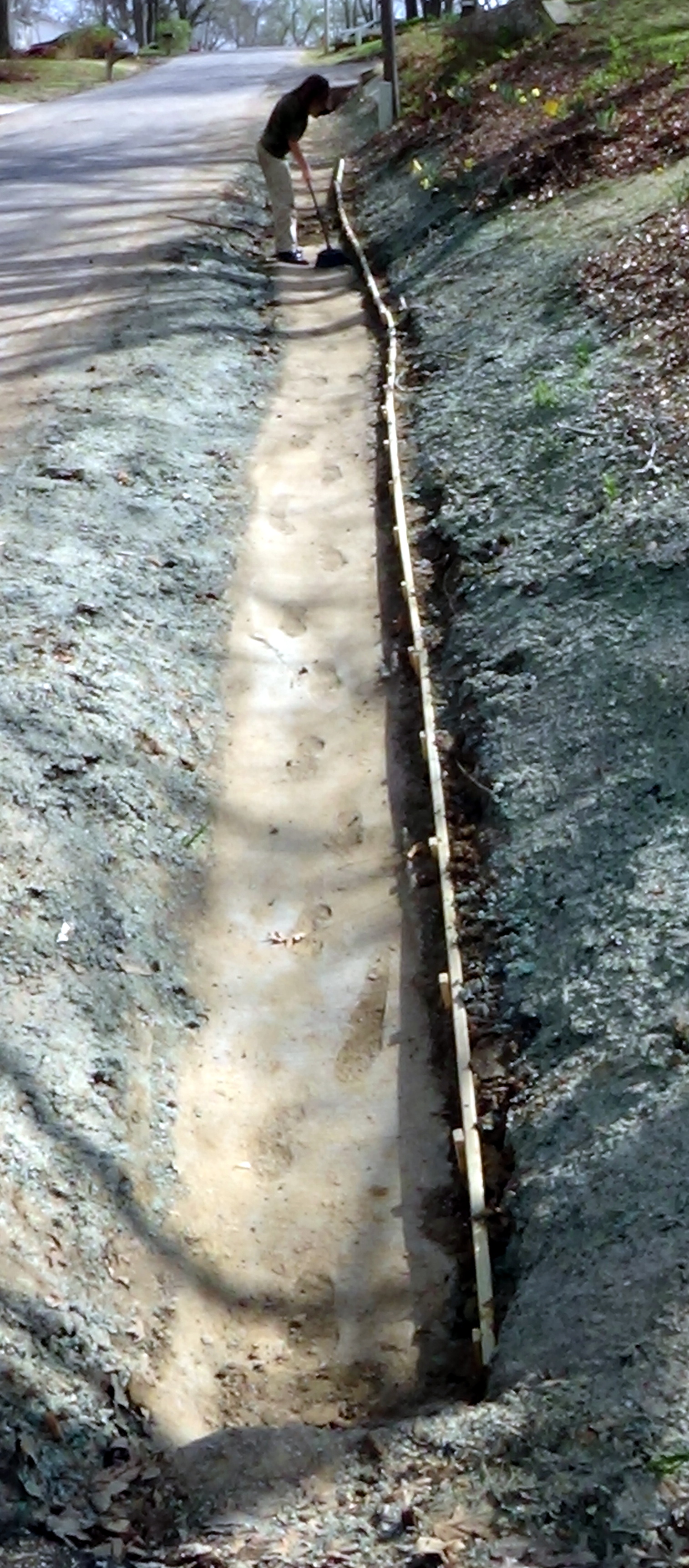 What is the ditch project, and what does the subject line of this blog mean? Well, ever since we moved into this house 10 years ago, I have had the idea that I wanted to put a border at the bottom of our front yard slope. Rains come by and slowly erode the slope. My thought was that a border of boards would hold the slope in place. But I never got to it.Over the years I talked to several people at Home Depot, church, and other places, who all gave me different ideas, none of which were exactly what I had in mind. So the project lay there in the idea stage. Then the water main came through and dug everything up, and now they laid new concrete down. It seemed to perfect time to execute. The earth is softer and easier to dig, and it is also in more danger of eroding because it has been dug up. The concrete I would be putting the boards against is also both straighter and more level that the previously heaved concrete