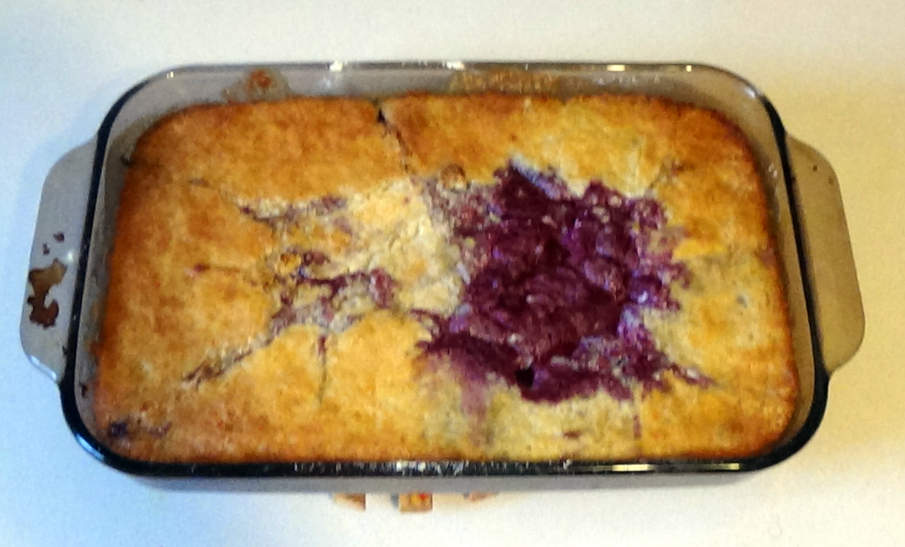 Of course it requires pitting all those cherries.  That ups the work quotient. Tried the fast fruit cobbler recipe my mother used. It calls for peaches as the default, but says to try cherries, berries or fruit in season.  I used frozen blueberries a couple of weeks ago when I made it.  The kids loved it, but they would have liked it better without the fruit!
