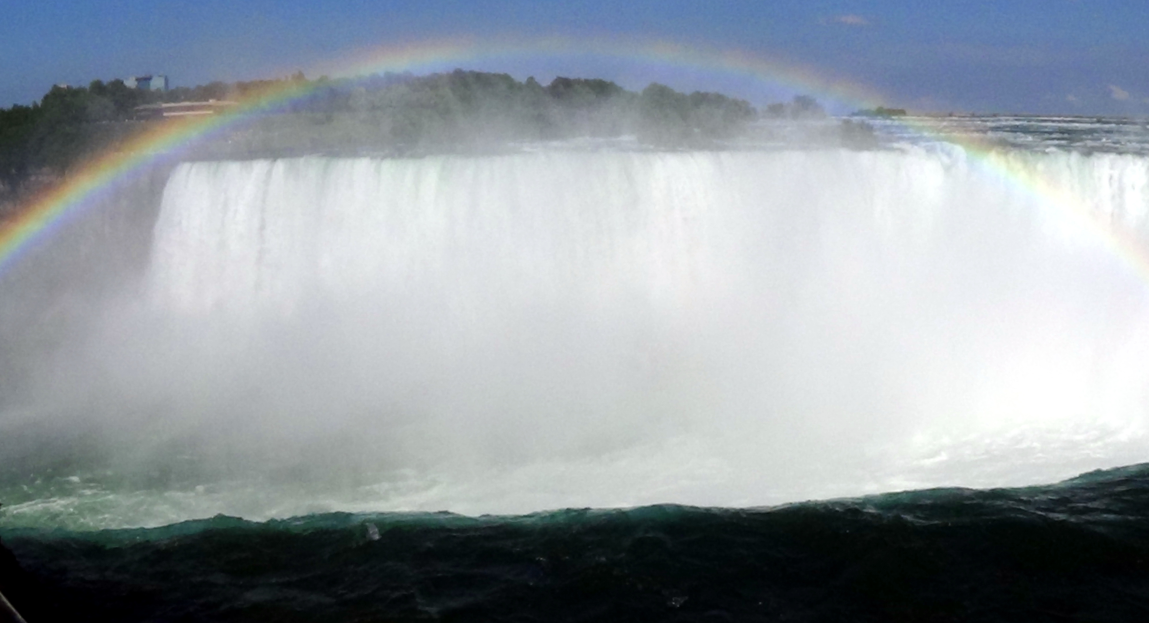 I had known the name of the bridge was the rainbow bridge, but I hadn’t known about the Bible connection. But as you see in the attached pictures, the rainbow is a prominent theme at Niagara Falls — the spray from the falls catches the light so you see them, often even double rainbows, from most any angle you look. And back in the 1940s when the bridge was built, they still remembered the source story of the rainbow to quote it on the bridge. Thank goodness no one has tried to have it updated yet in our modern age.