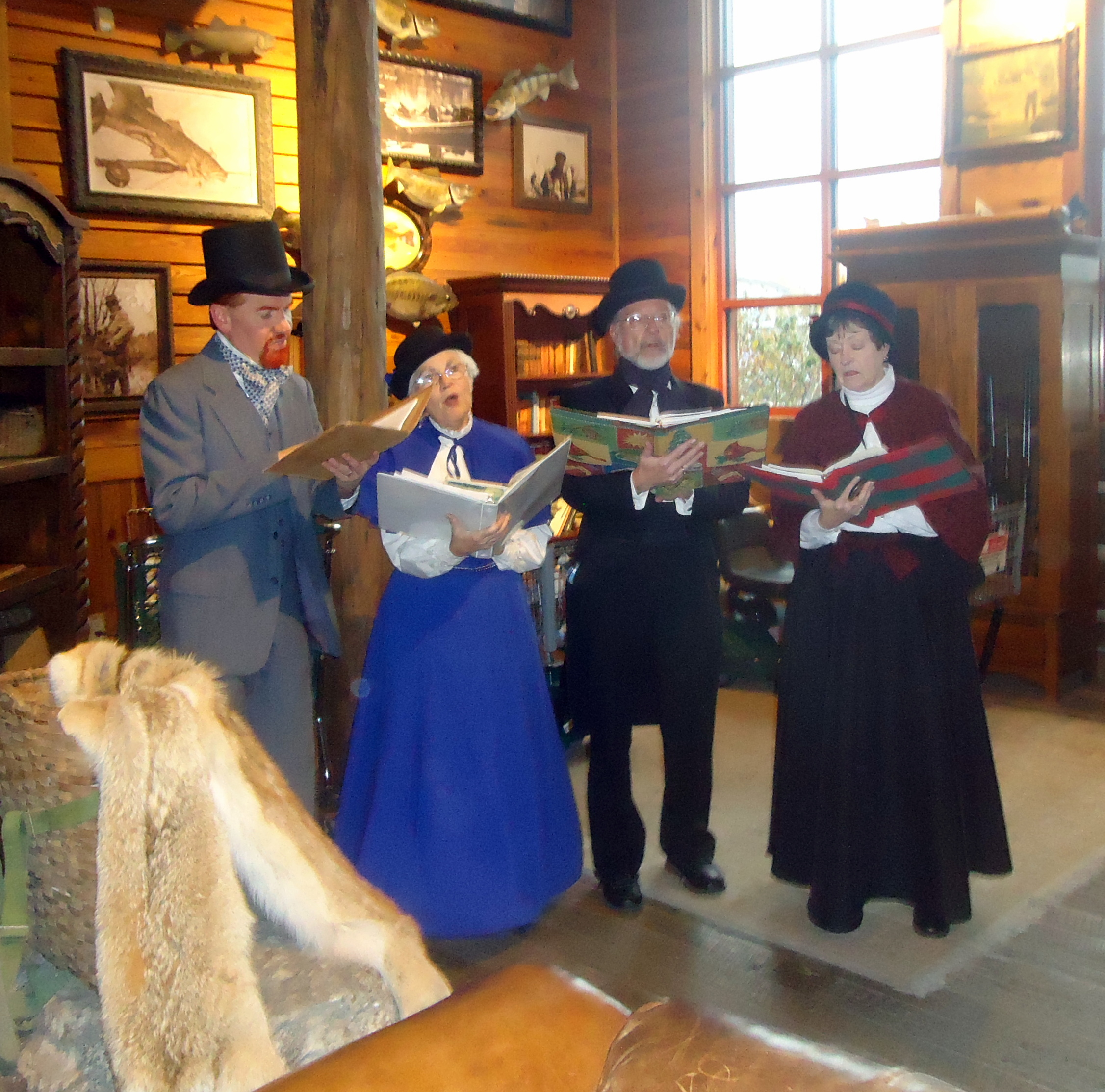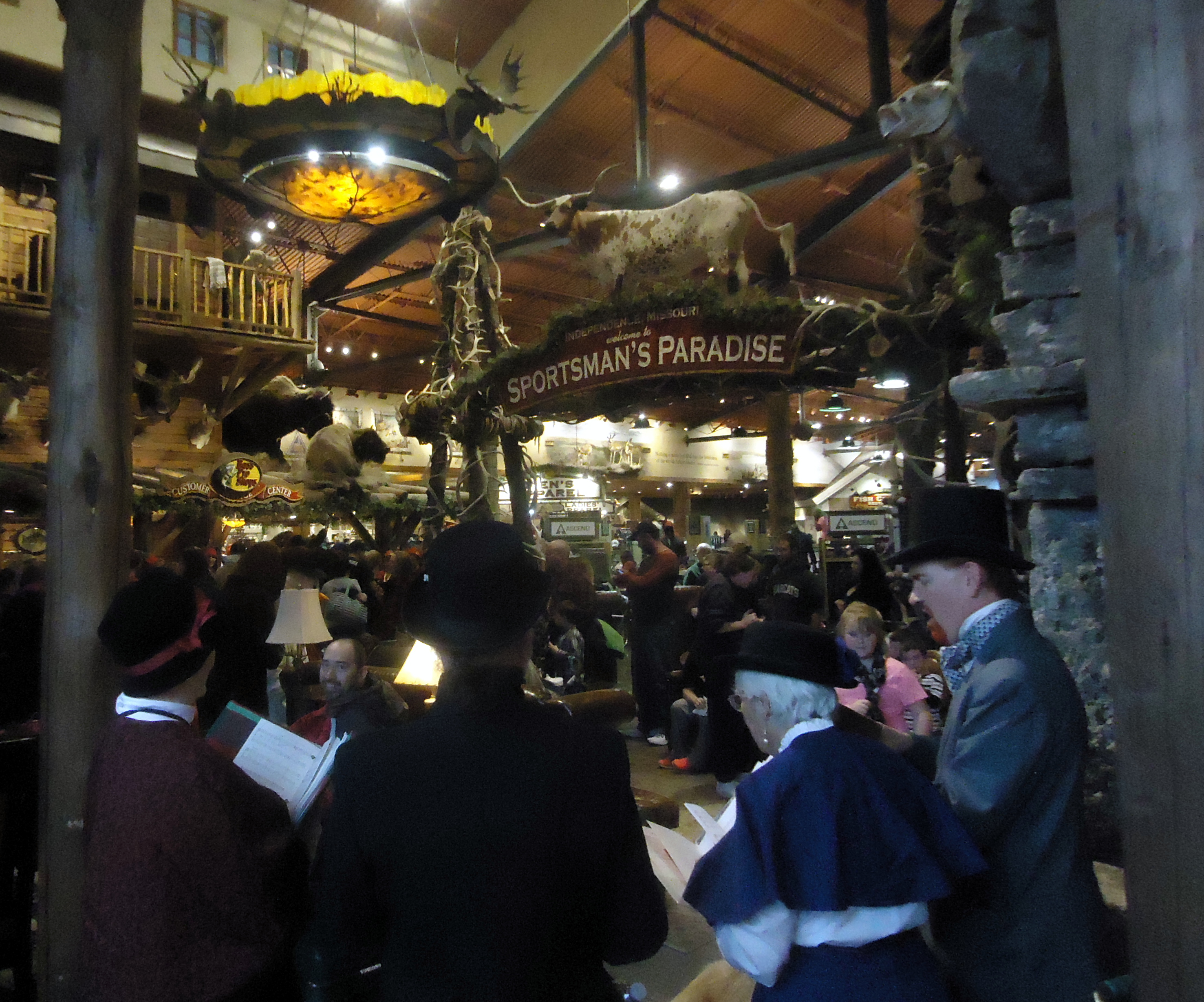 A bit after 5 p.m. the announcement was made — Santa was on his way. Many people went outside to watch Santa arrive on the Bass Boat. We carolers waited inside to sing Santa into the store: Santa Claus is Coming to Town, Jolly Old St. Nicholas, Up on the Housetop.