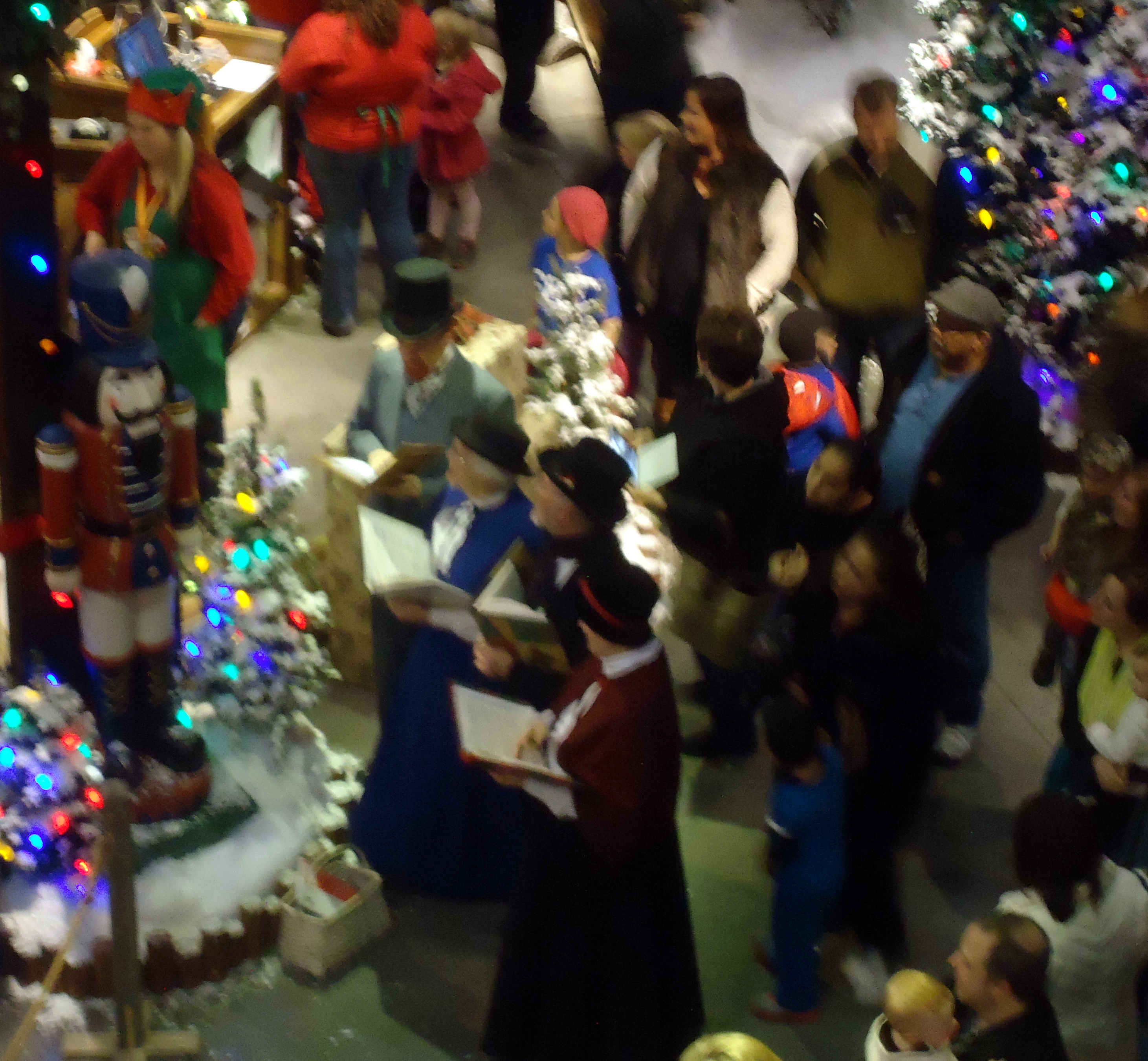 At the Workshop there was a ribbon-cutting ceremony to open the shop, and then people lined up for their pictures with Santa. Carolers of Note spent the rest of our time there strolling up and down the line of people waiting for Santa pictures singing their favorite requests.
