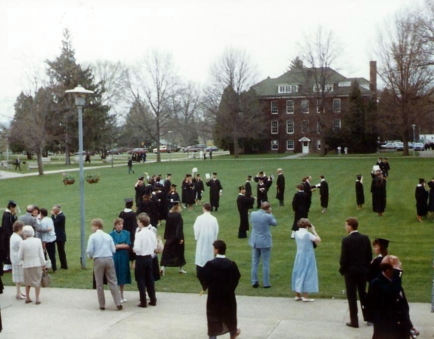 The pictures of the Houghton College Quad are definitely vintage in the after-ceremony milling shots. The one shot shows Wollsey hall, that is no longer there, and every shot probably has something that could easily date it.