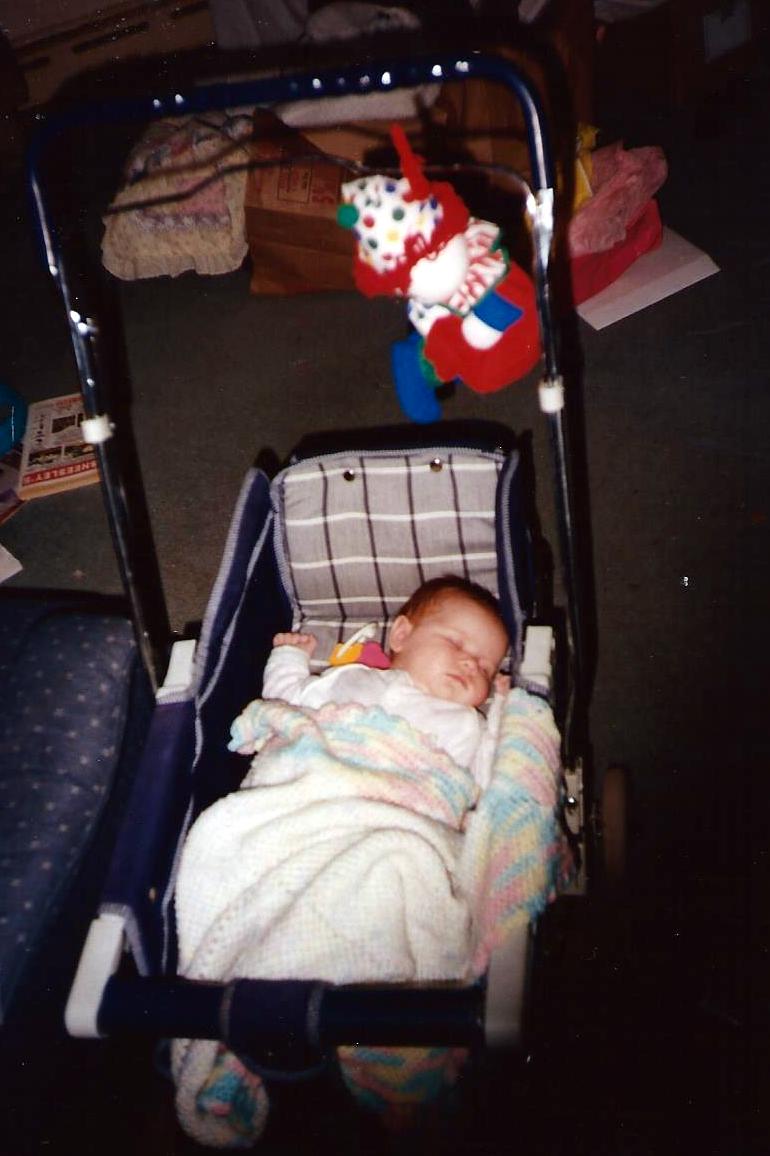 Something I cannot see a good picture of is something I can remember vividly as part of an incident in Carly’s life. We had a swing that had a seat and a mesh sided mini-bed. I don’t see any clear pictures of the swing. But I do still see the pictures of the basinet. The idea was Carly would sleep in the basinet. But we couldn’t lay her down in it if she wasn’t already asleep. We could lay her down in the swing’s mini-bed.