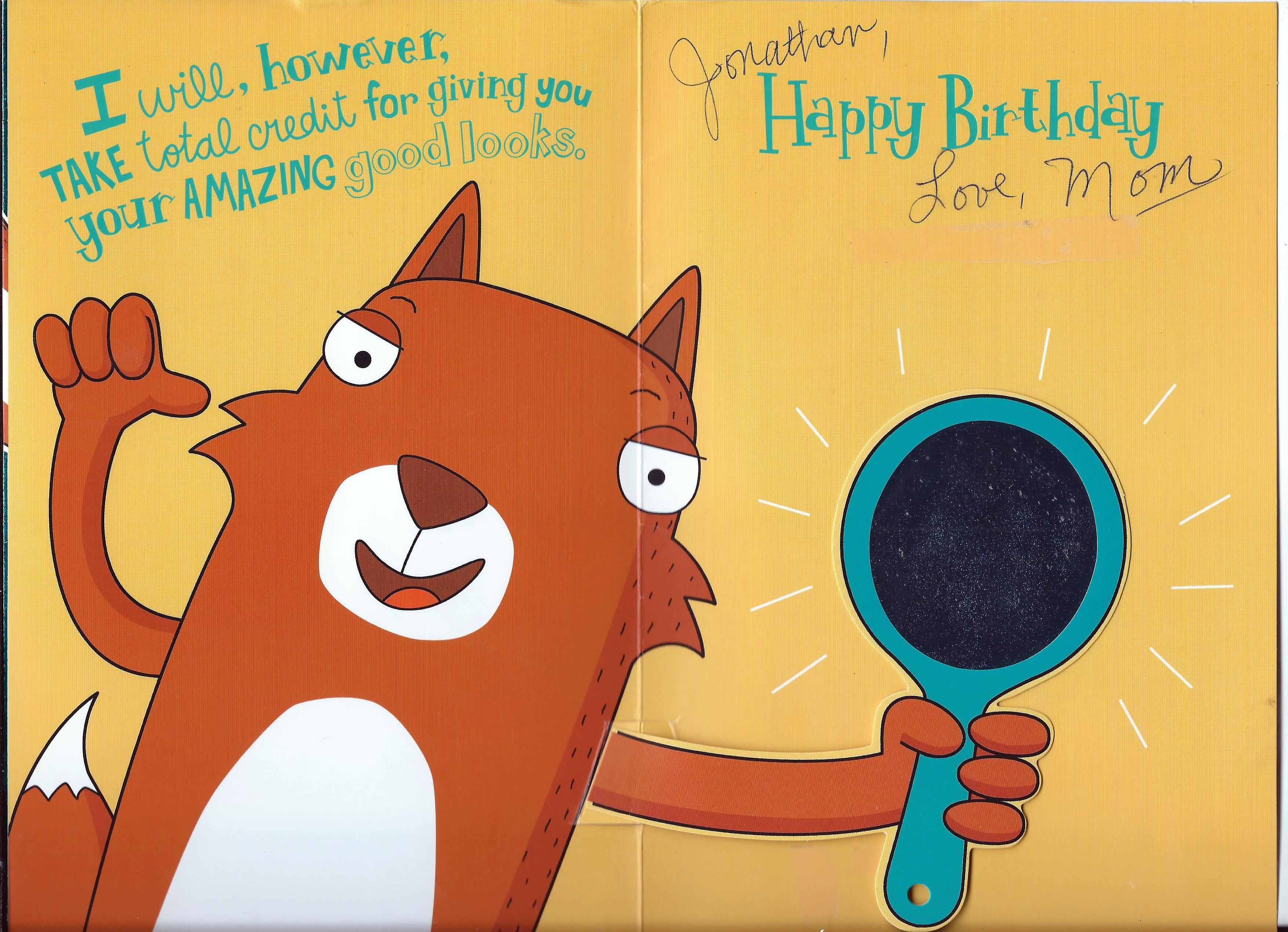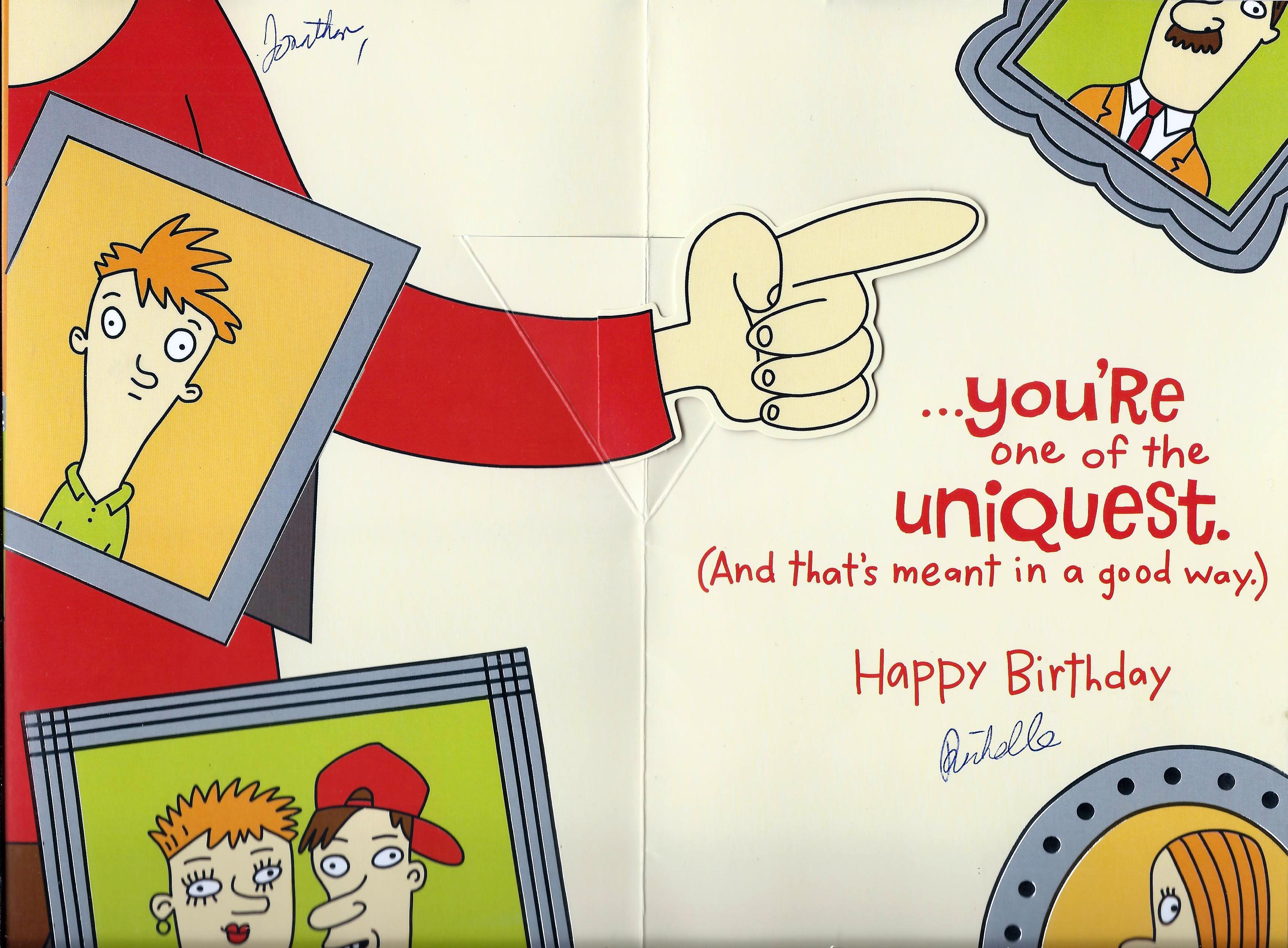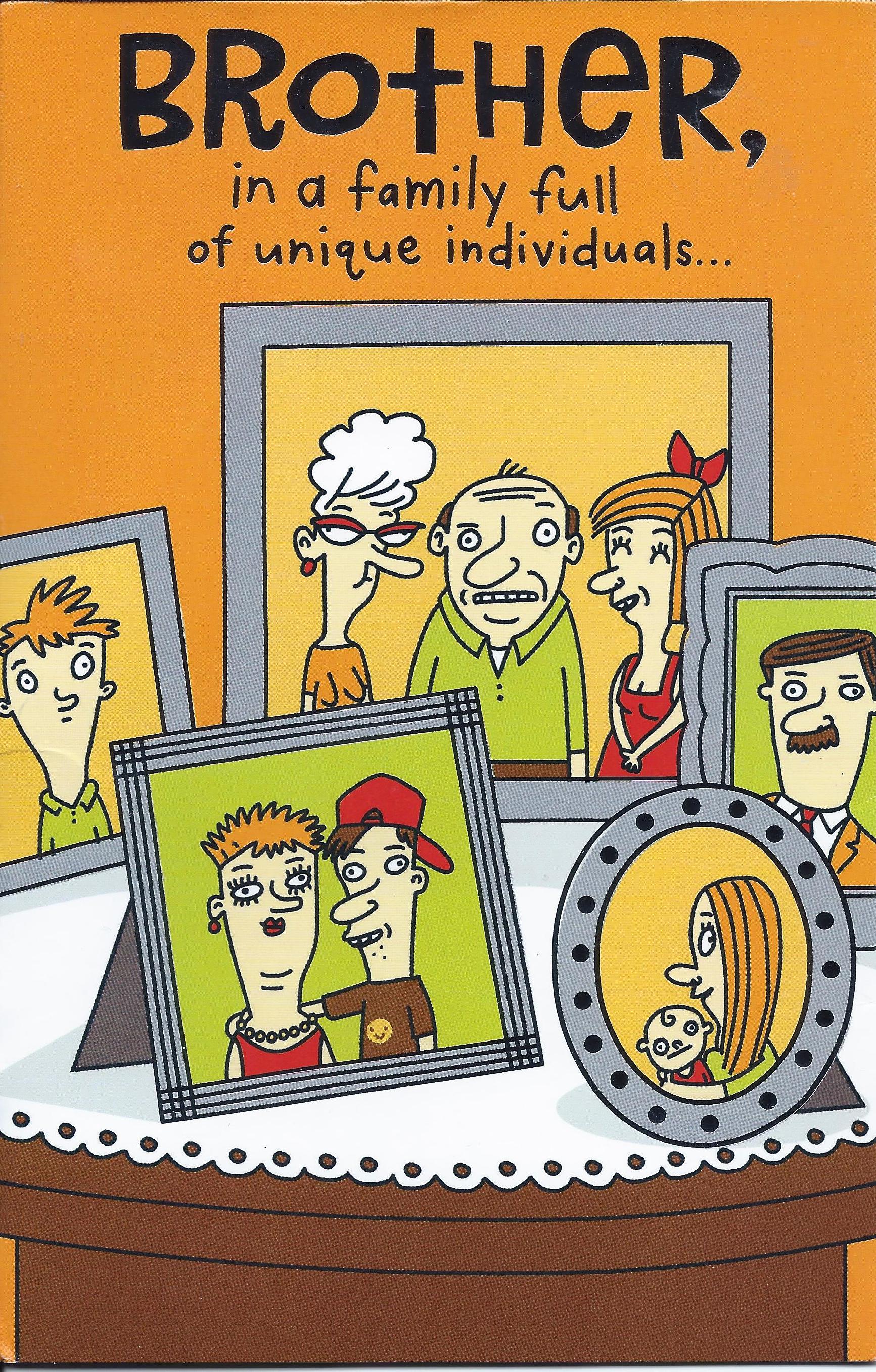I was born a second son, and became the middle of three children. And a lot has happened in the intervening years. We still stay in contact, even though in three different states. And we still have an interesting sense of humor. For instance, see the below birthday cards — which are part and parcel of the type of cards we have exchanged through the years.