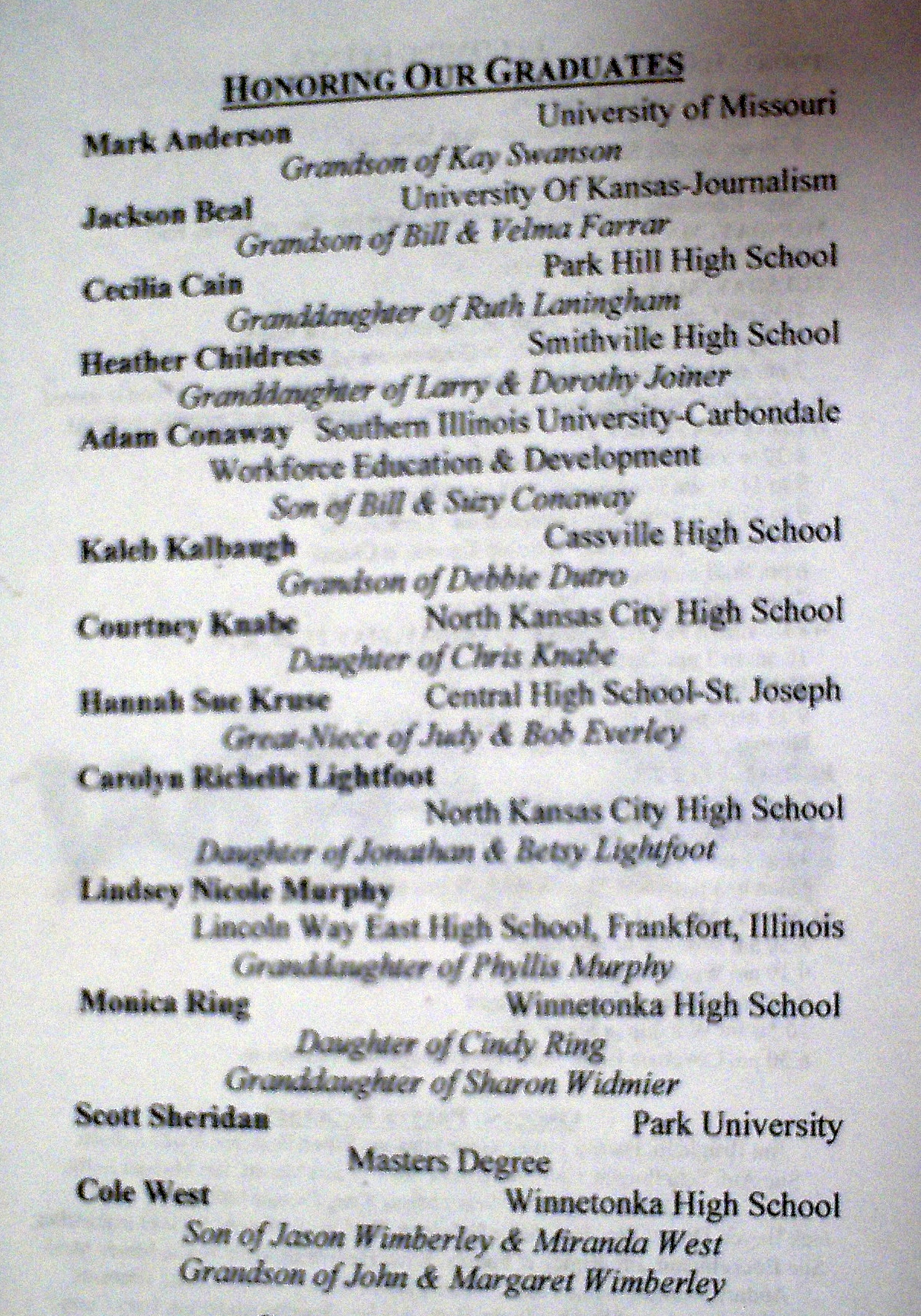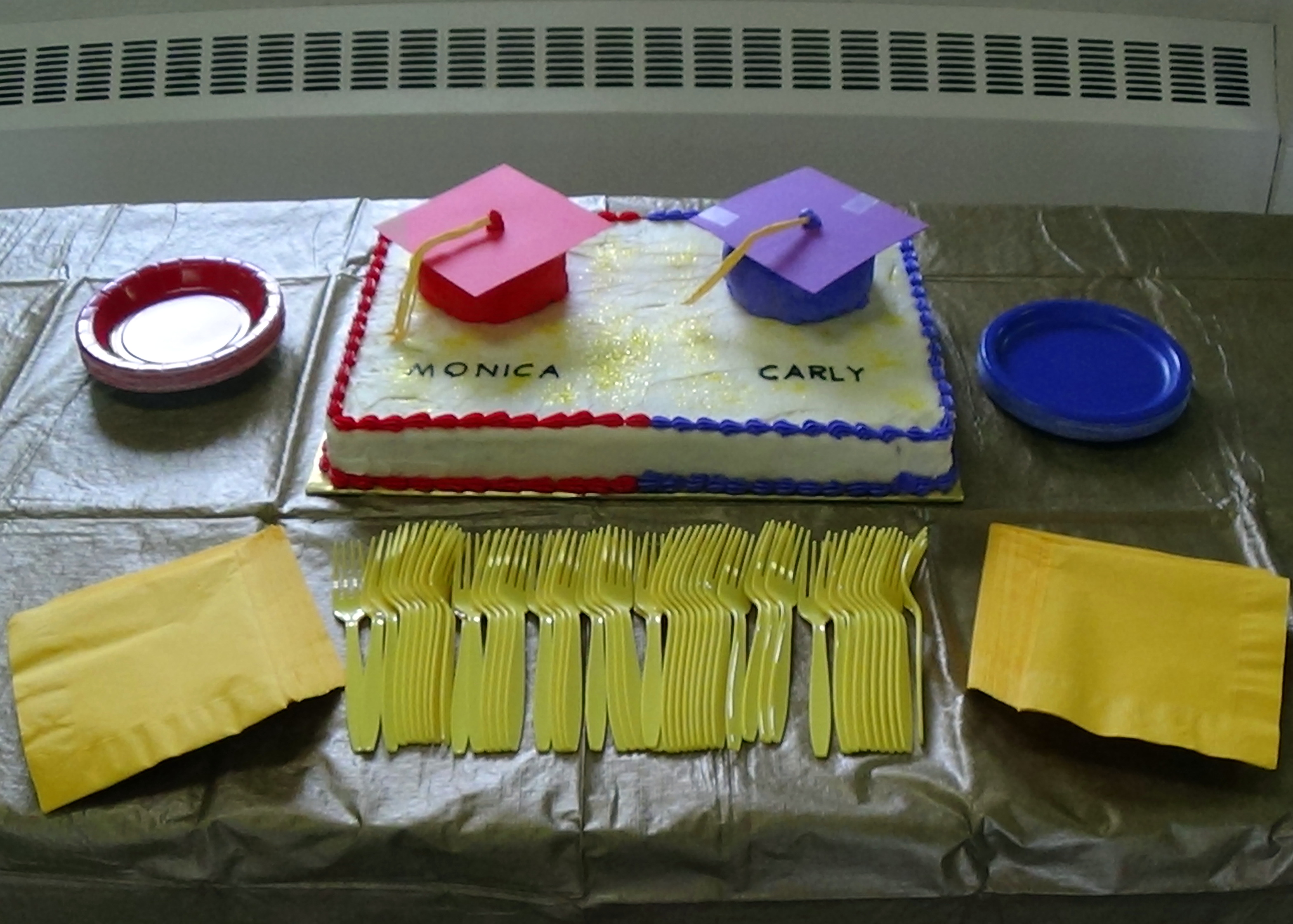 It was a nice reception. Suzy Conaway made a nicely decorated cake topped with mortarboards in the school colors of the two graduates, with their names inscribed on the cake. That one school was red and gold and the other purple and gold worked very well in the color scheme of the cake. One side was red, the other purple, with gold “glitter” on top of the cake between and around the mortarboards.