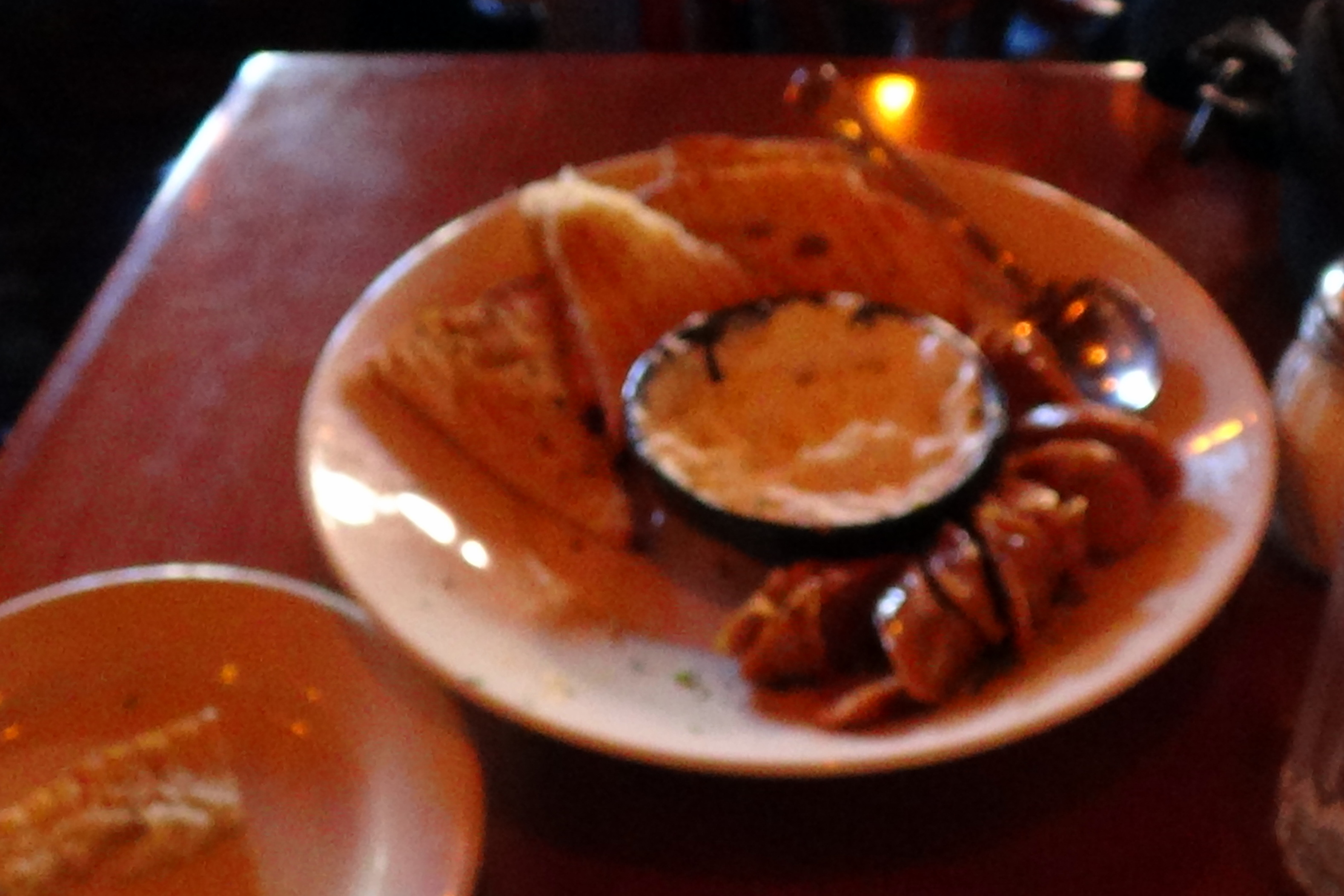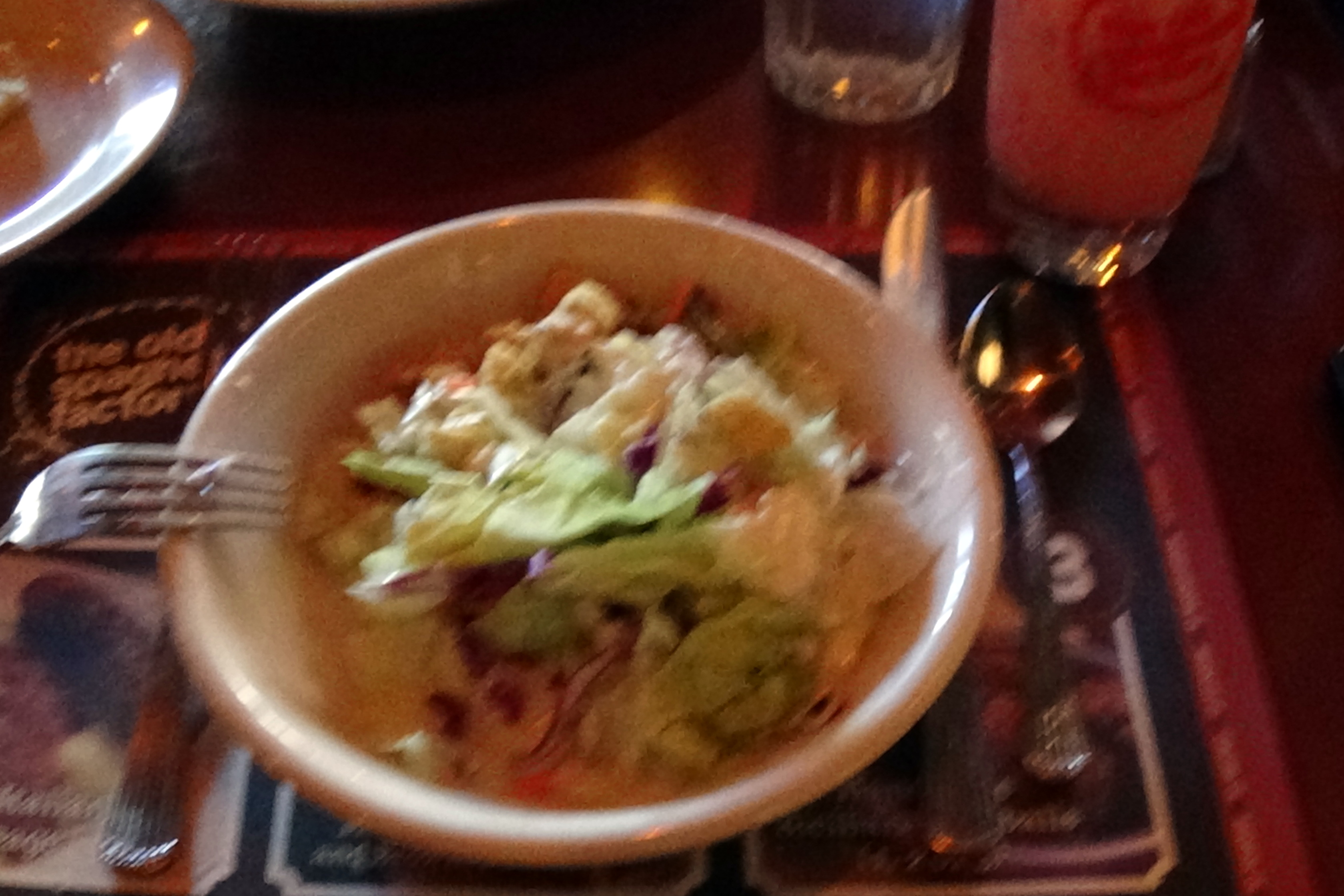 For my meal I splurged on an appetizer, the new Gorgonzola Dip (for one person?), and two Italian Cream Sodas — one blackberry, the other raspberry (no free refills). These went with the three-course entree I had chosen: Salad, main course (meat lovers treat of sausage, meatball and spaghetti with sauce), Spimoni.