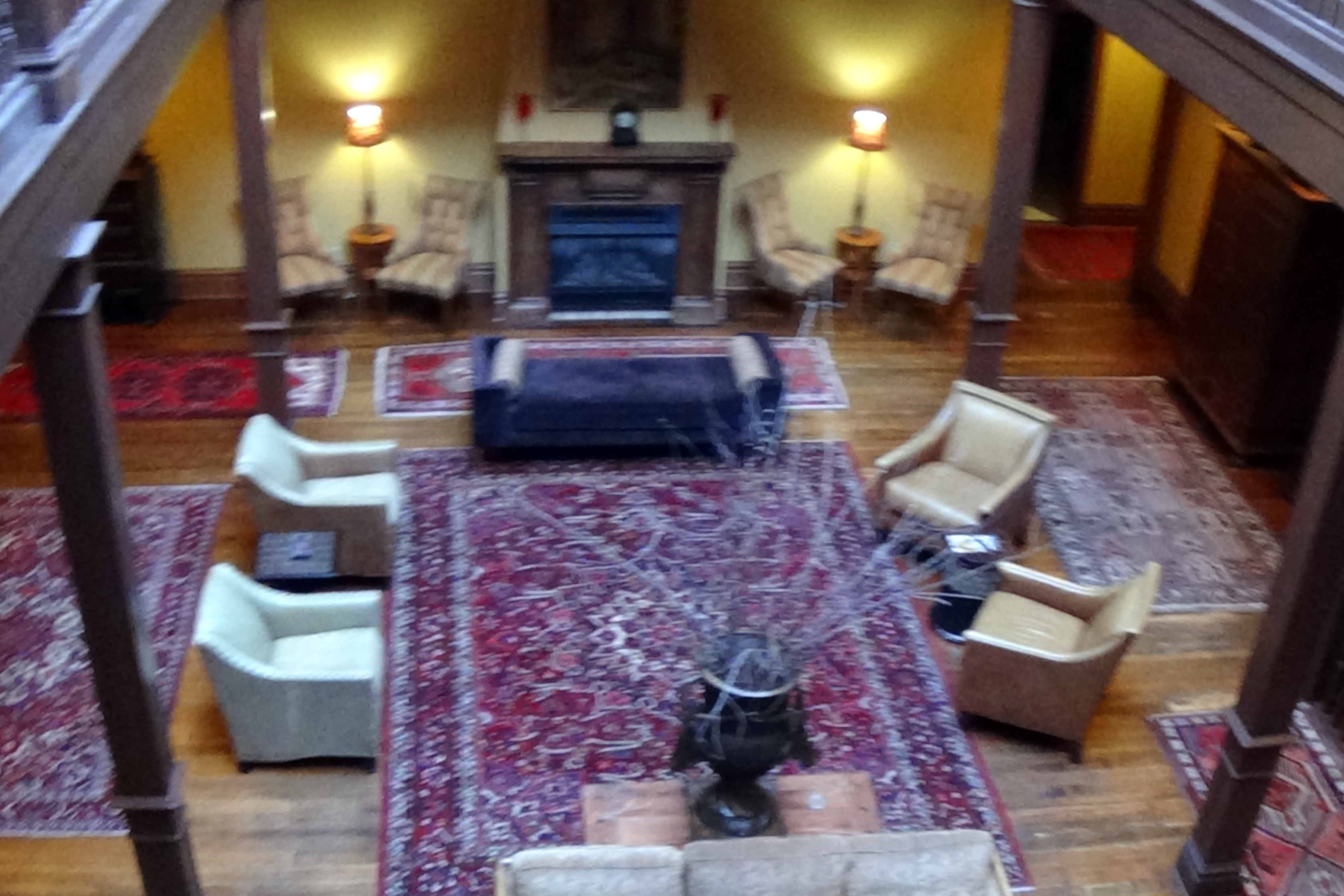 Most of the rooms are on the second and third floors, built around a central seating area on the second floor, which is open two floors for look-over internal balconies on the third floor.