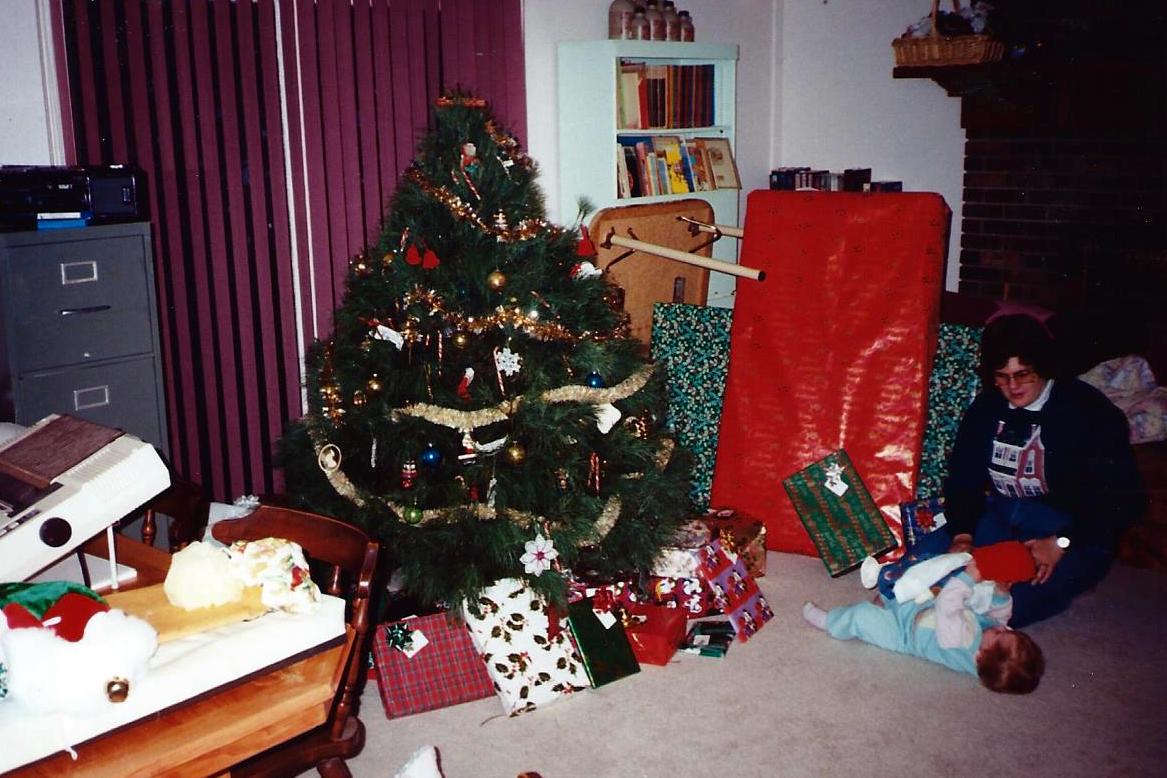 That was a year where we had a live tree, as you can see above. The big wrapped packages were the parts of the new full-sized crib we had ordered for her, and waiting to be assembled. See some of the assembly below: