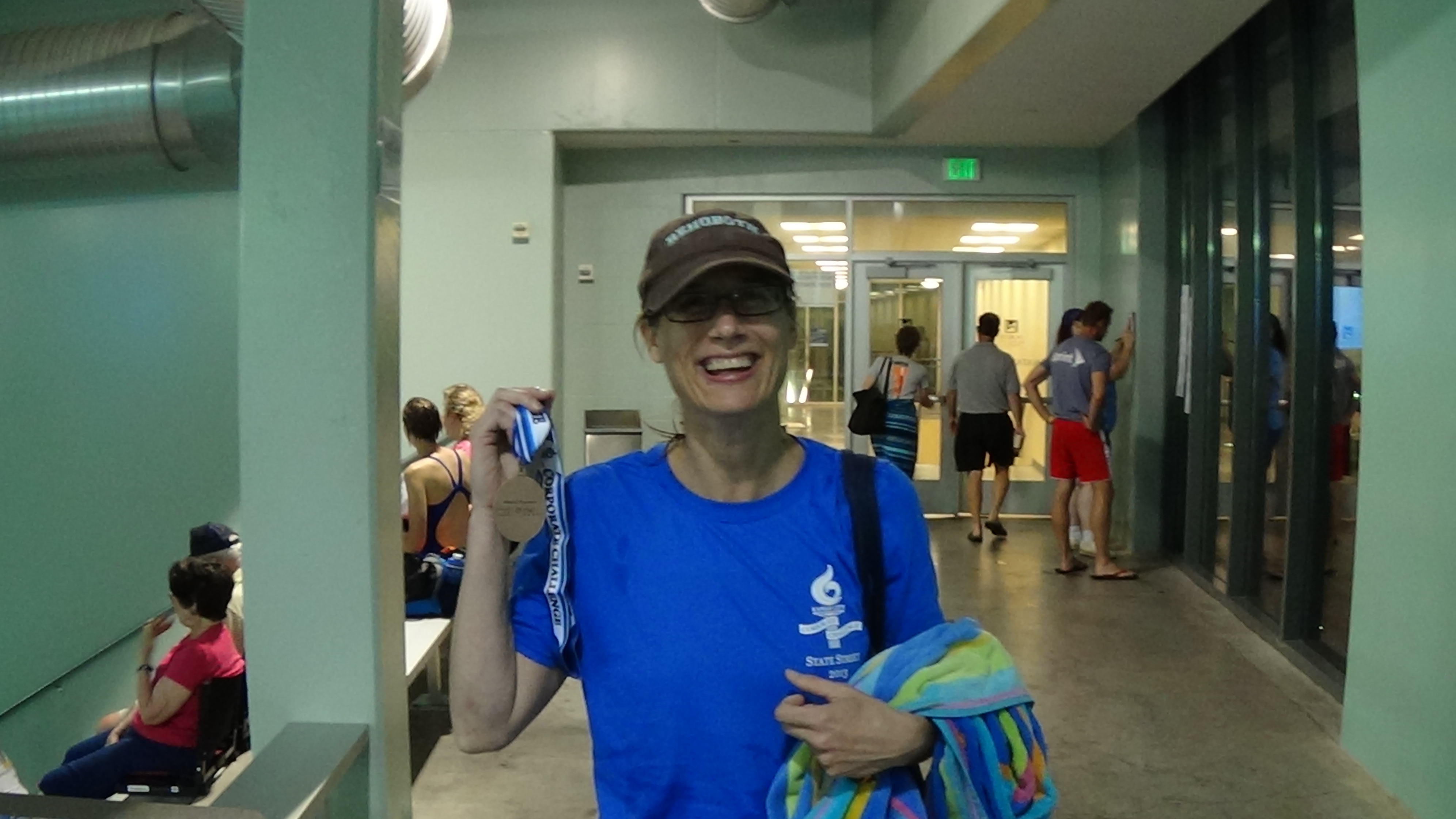 Monica was one of the special ones over the years. She had great esprit de corps for the team, and was also a good swimmer, usually in a 4th, 5th or 6th place finish. Until 2013. When the dust had cleared to the event seen here, Monica had actually finished 3rd over all for her bracket, earning her an actual medal. It happened after she had made some comments about not ever medalling at the meet, and was, and still is, one of my fondest memories of the swim meets over the years.